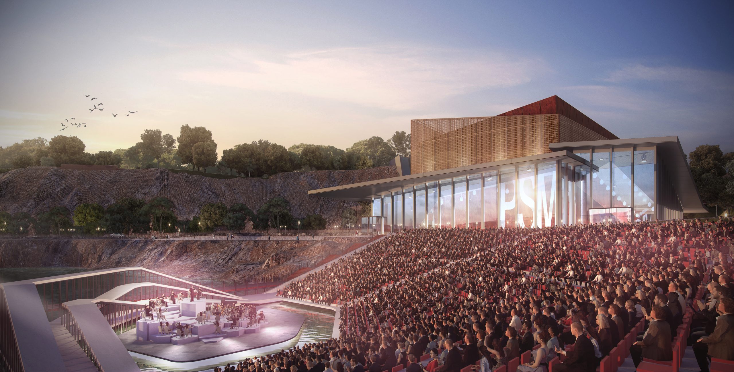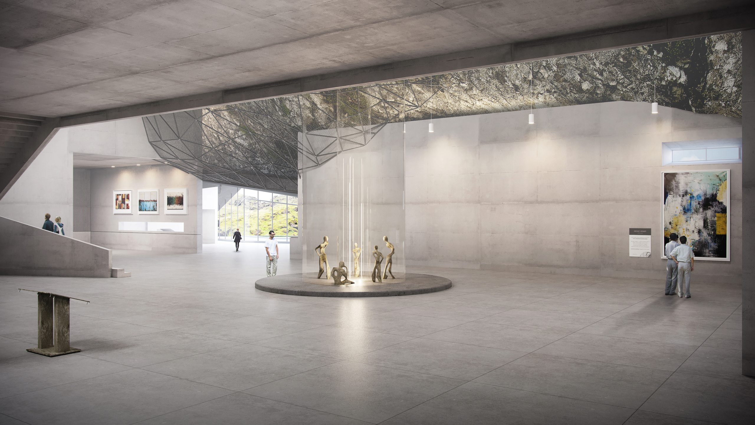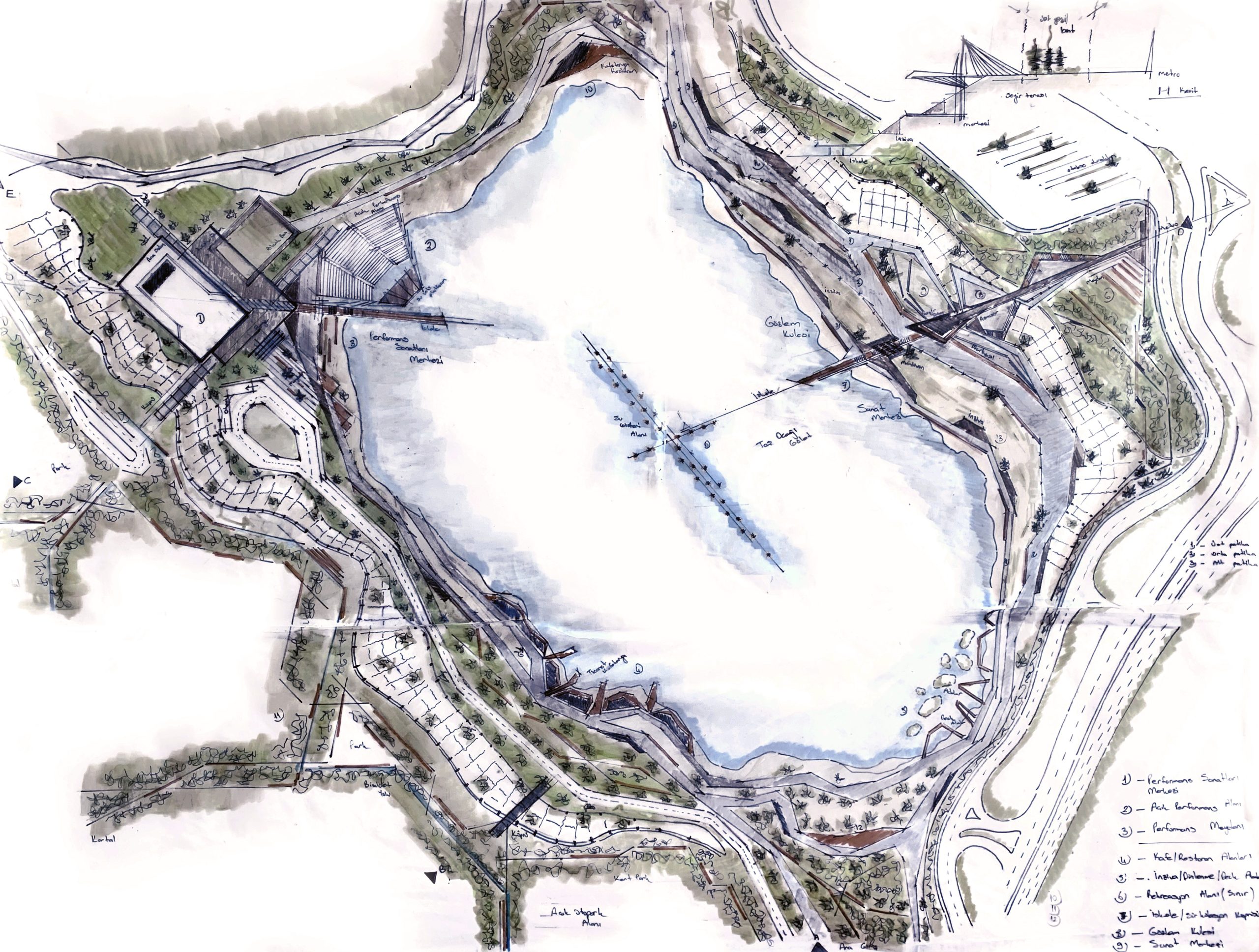 The architectural design adopts a radial spatial strategy that follows the natural topography of the quarry pit. The project introduces multiple pedestrian access points from higher elevations down to the lake, promoting fluid circulation. Around this central basin, public spaces are distributed in layers, integrating event platforms, commercial units, observation towers, performance venues, restaurants, and a contemporary arts museum.