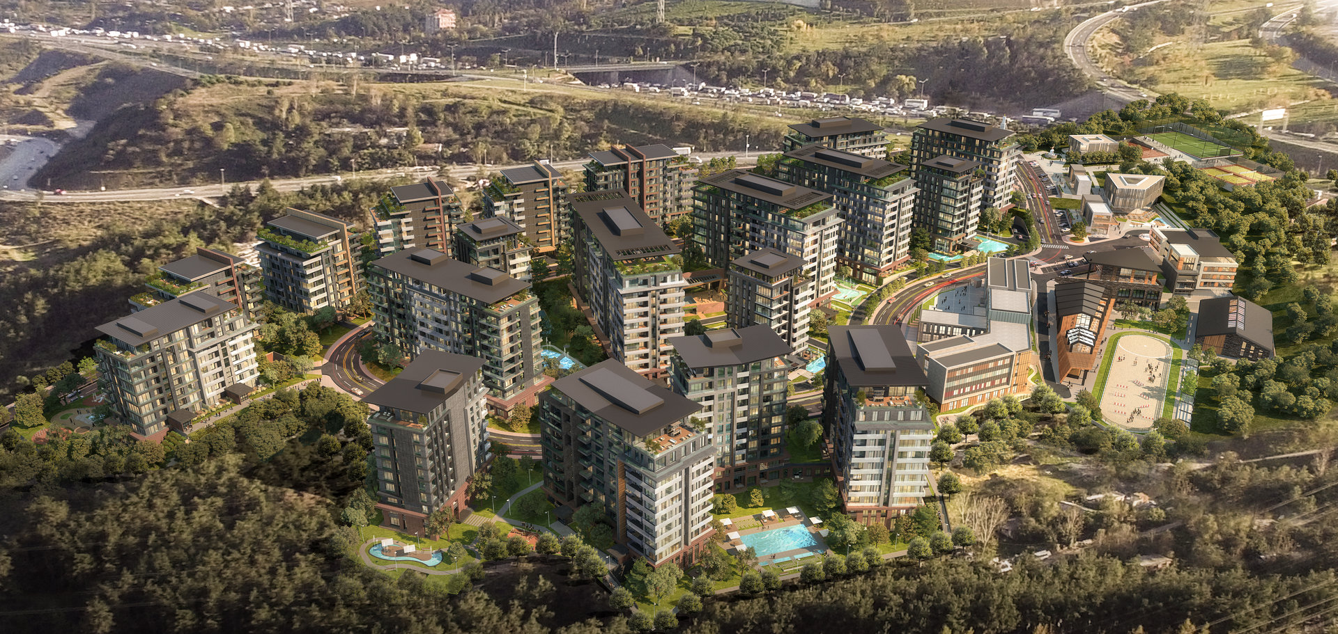 Planned in five phases, the masterplan combines diverse housing typologies with complementary functions including a sports academy, commercial units, an equestrian center, and generous recreational amenities. All residential blocks are oriented to maximize northern forest views, natural ventilation, and daylight access. Upper floor terraces are directed northwards, offering residents continuous visual and sensory connection with the surrounding woodland.