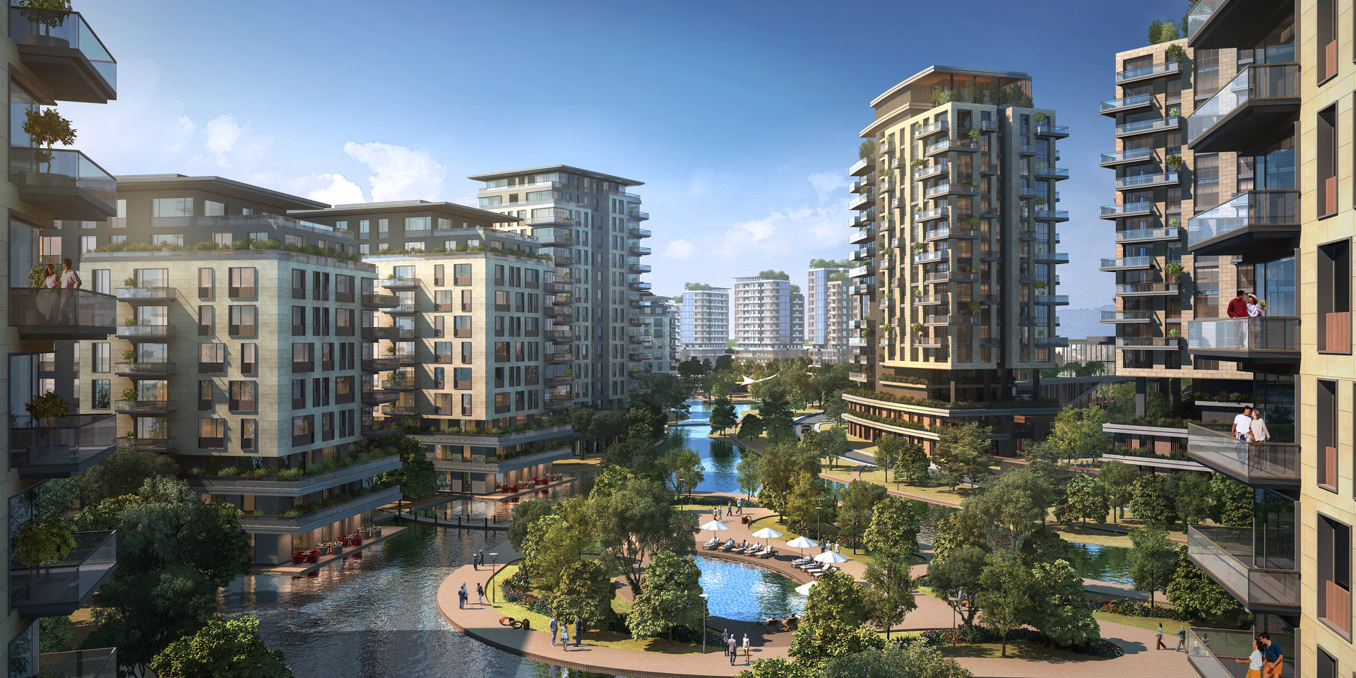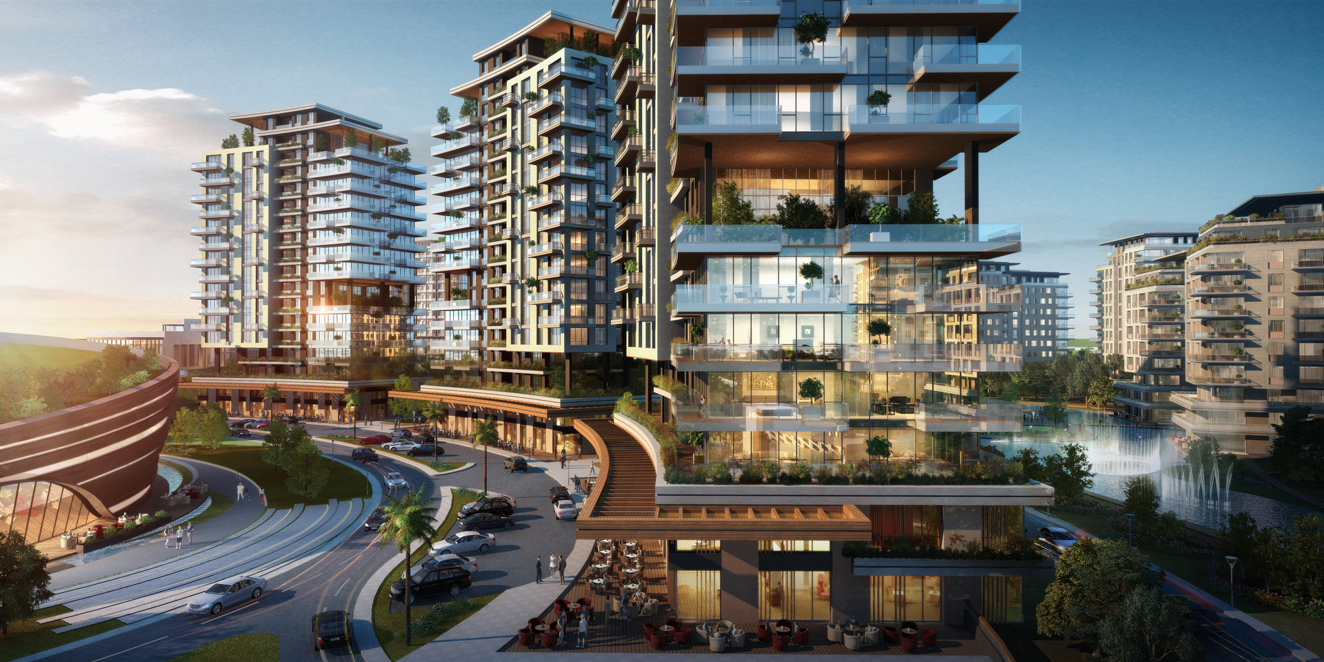 The site’s functional zoning strategy prioritizes spatial quality and user experience. After traversing the railway and buffer landscape, users encounter the commercial and office zones, which activate the public interface. The residential blocks are located further inward, shielded from external noise and oriented towards landscape courtyards and the distant Caspian Sea horizon.