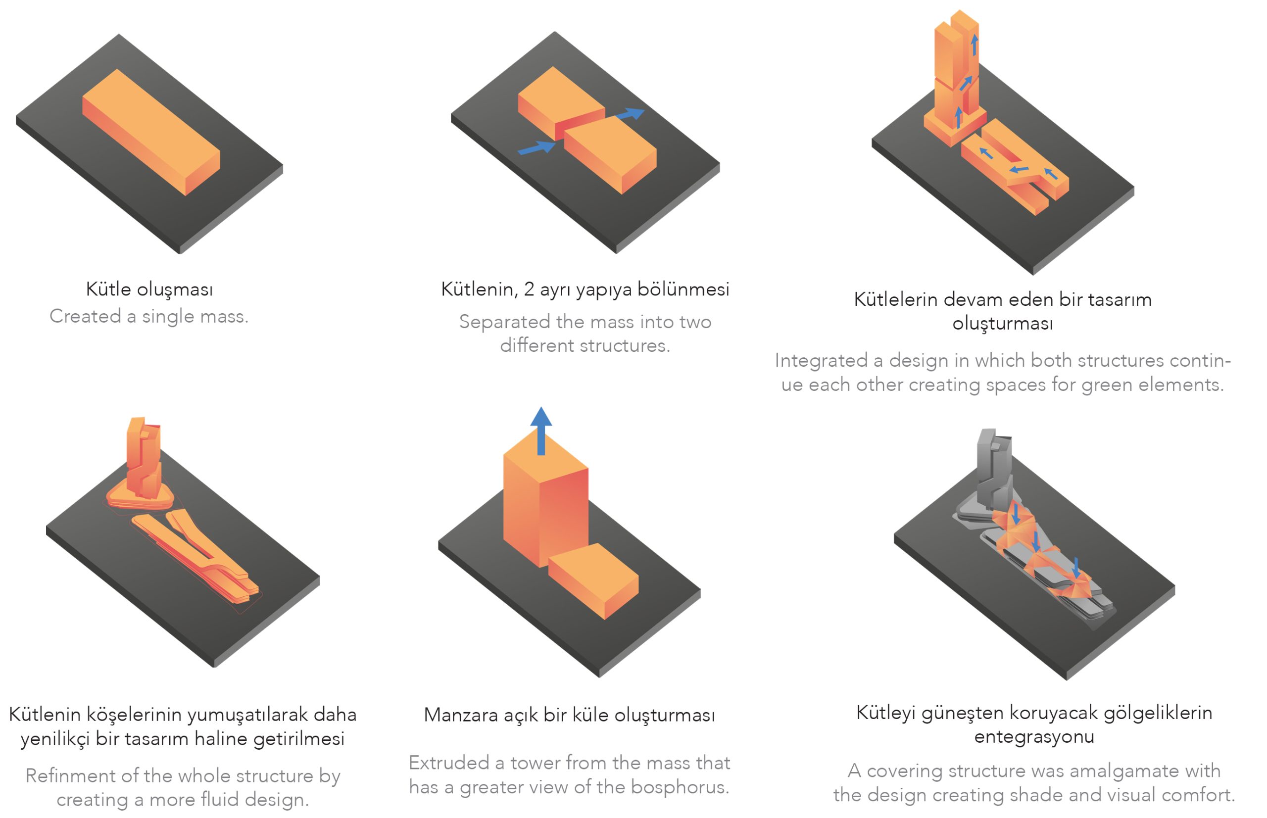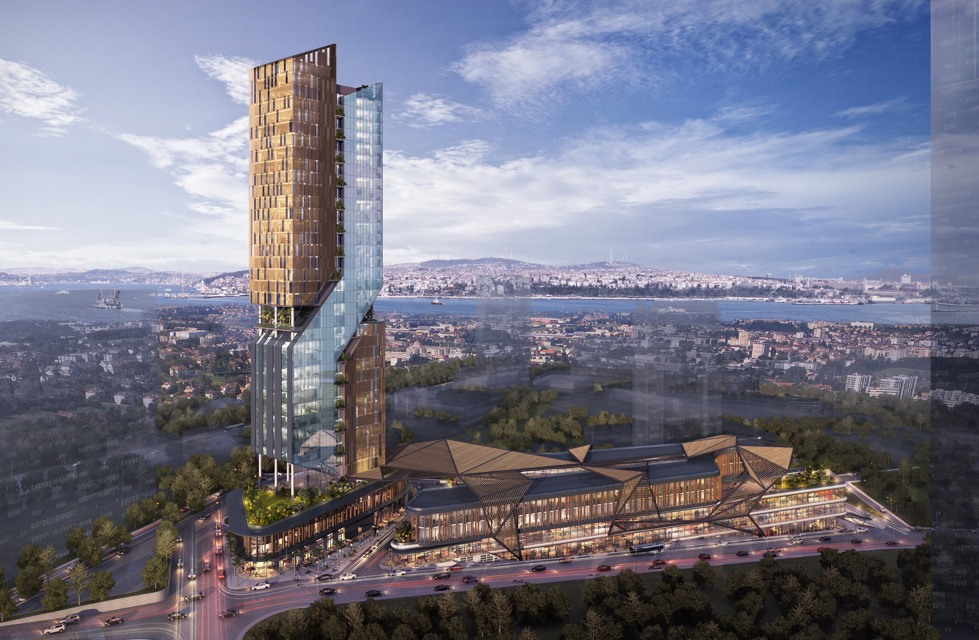 The project is conceived as two distinct volumes that respond to both urban and topographical context through a layered architectural strategy. While one block addresses the commercial axis along the street, the other opens toward the Bosphorus, offering panoramic views to upper-level users. This dual orientation ensures visibility, accessibility, and prestige for diverse functions. A dynamic façade articulation, generous terraces, and a green buffer zone contribute to the building’s architectural identity.