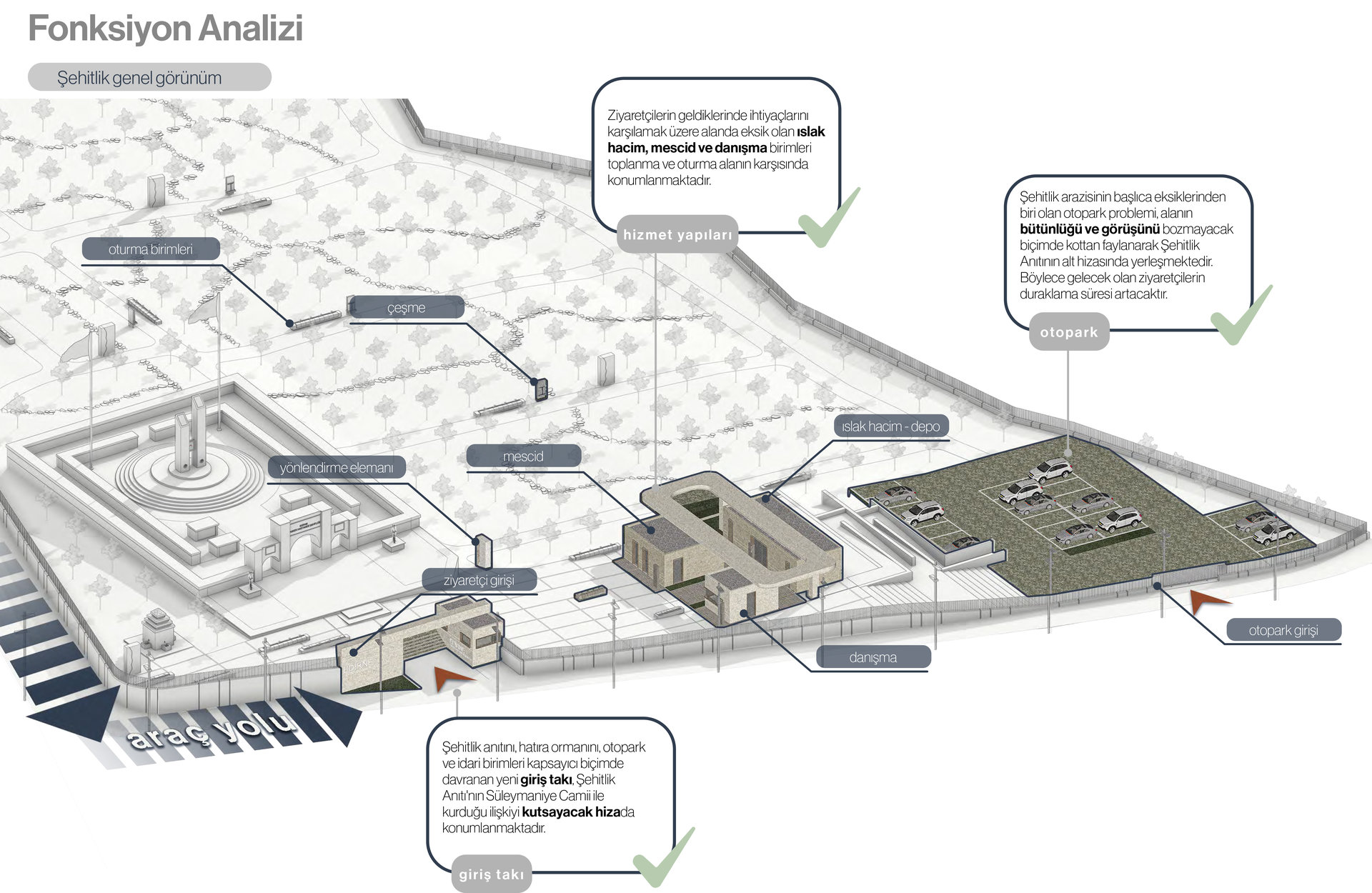 A new entrance gate has been designed to integrate the martyrdom monument, memorial forest, parking, and administrative facilities, positioned to symbolically align with the Süleymaniye Mosque.