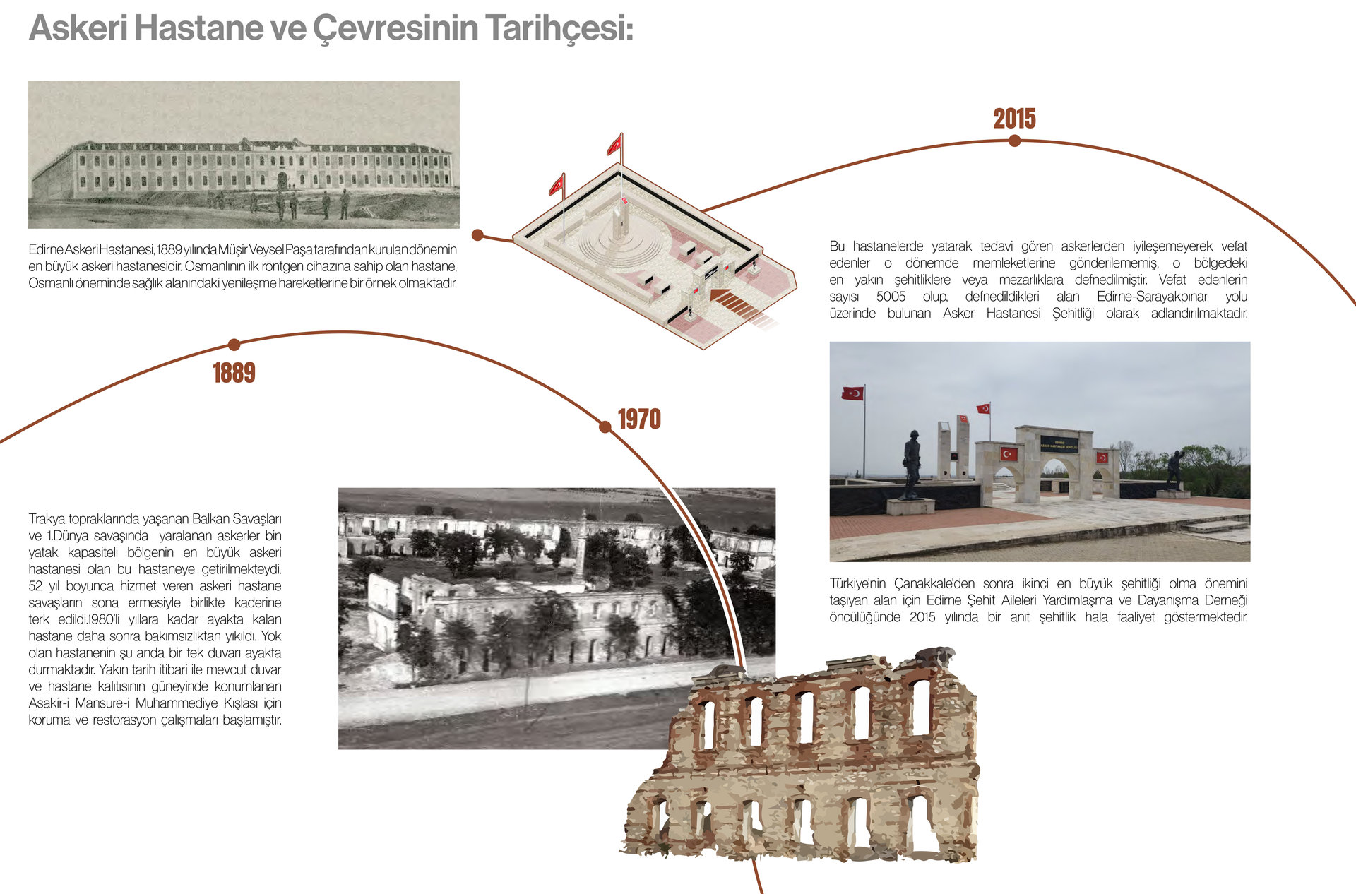 Founded in 1889 by Field Marshal Veysel Pasha, the Edirne Military Hospital was the largest of its time. It became a symbol of modernization in Ottoman healthcare as the first facility equipped with an X-ray device. During the Balkan Wars and World War I, wounded soldiers were brought to this 1,000-bed hospital. Serving for 52 years, the hospital was abandoned after the wars and eventually collapsed due to neglect in the 1980s, leaving only one wall standing today. Adjacent to it, the Asakir-i Mansure-i Muhammediye Barracks is currently undergoing preservation and restoration works.
