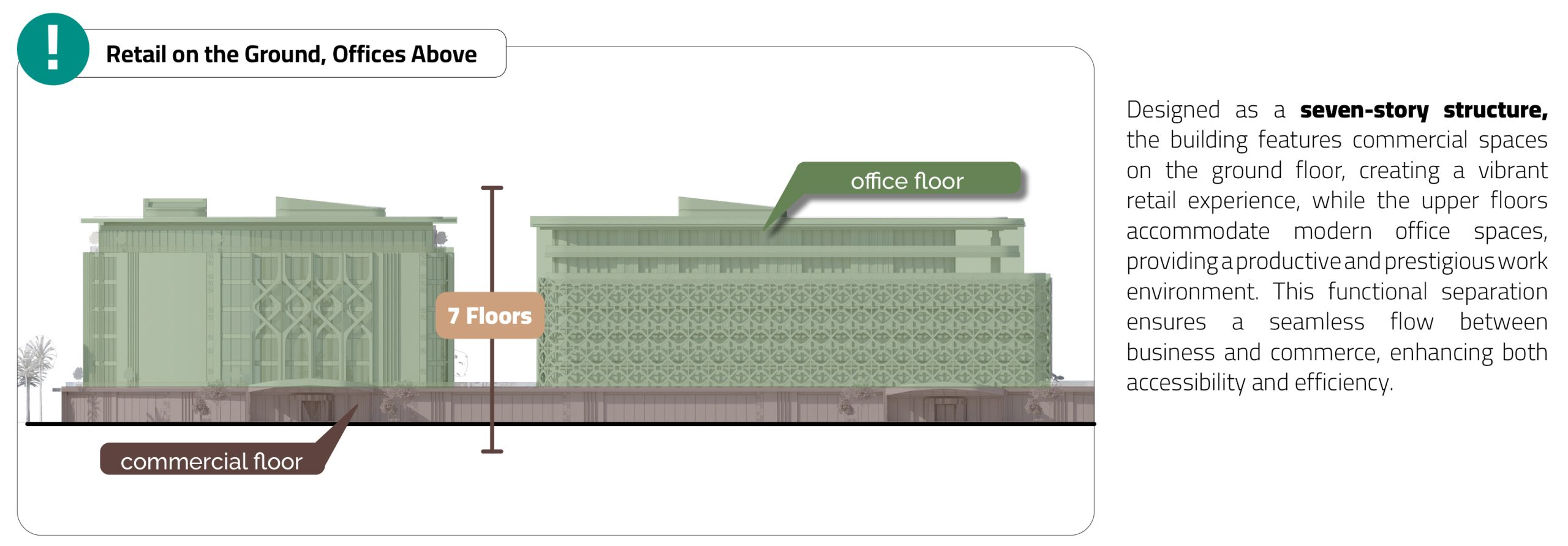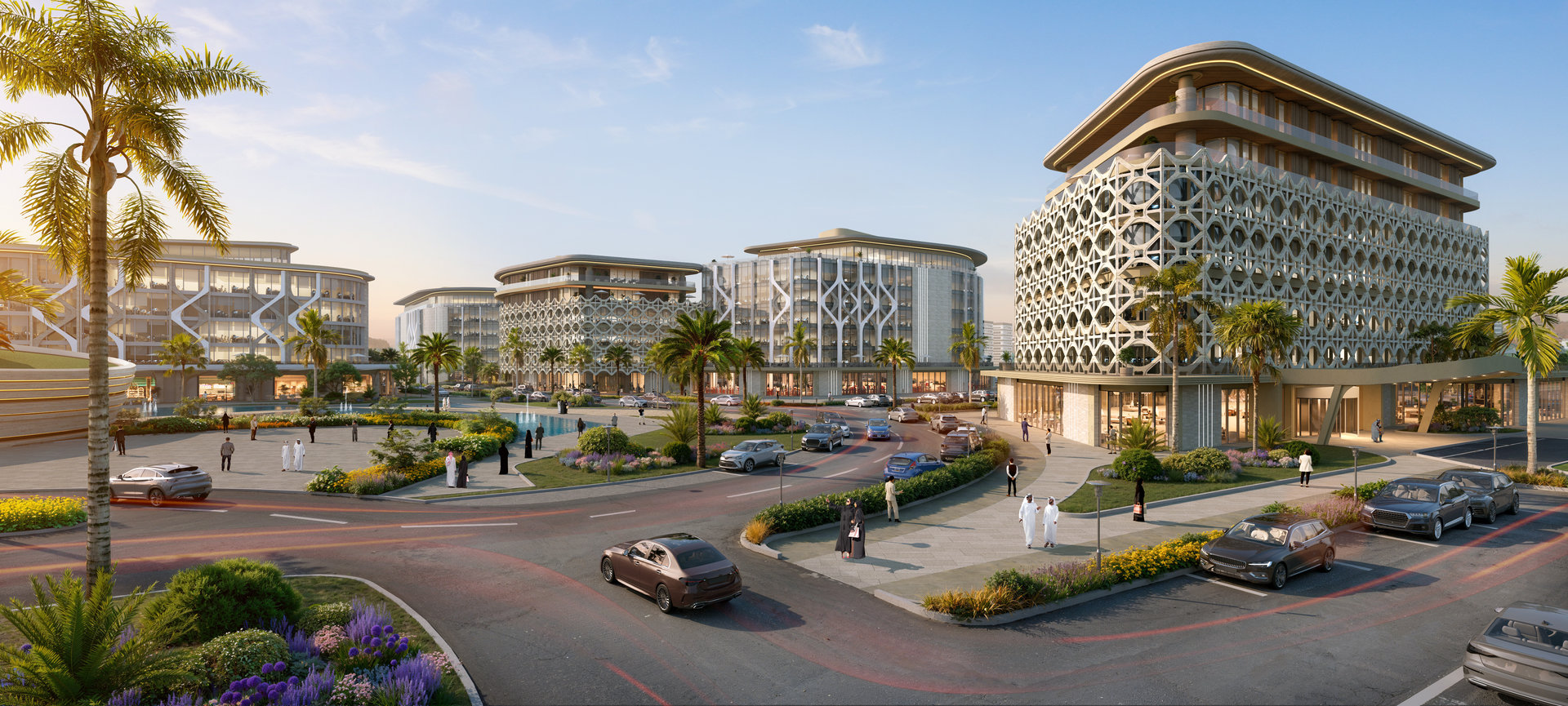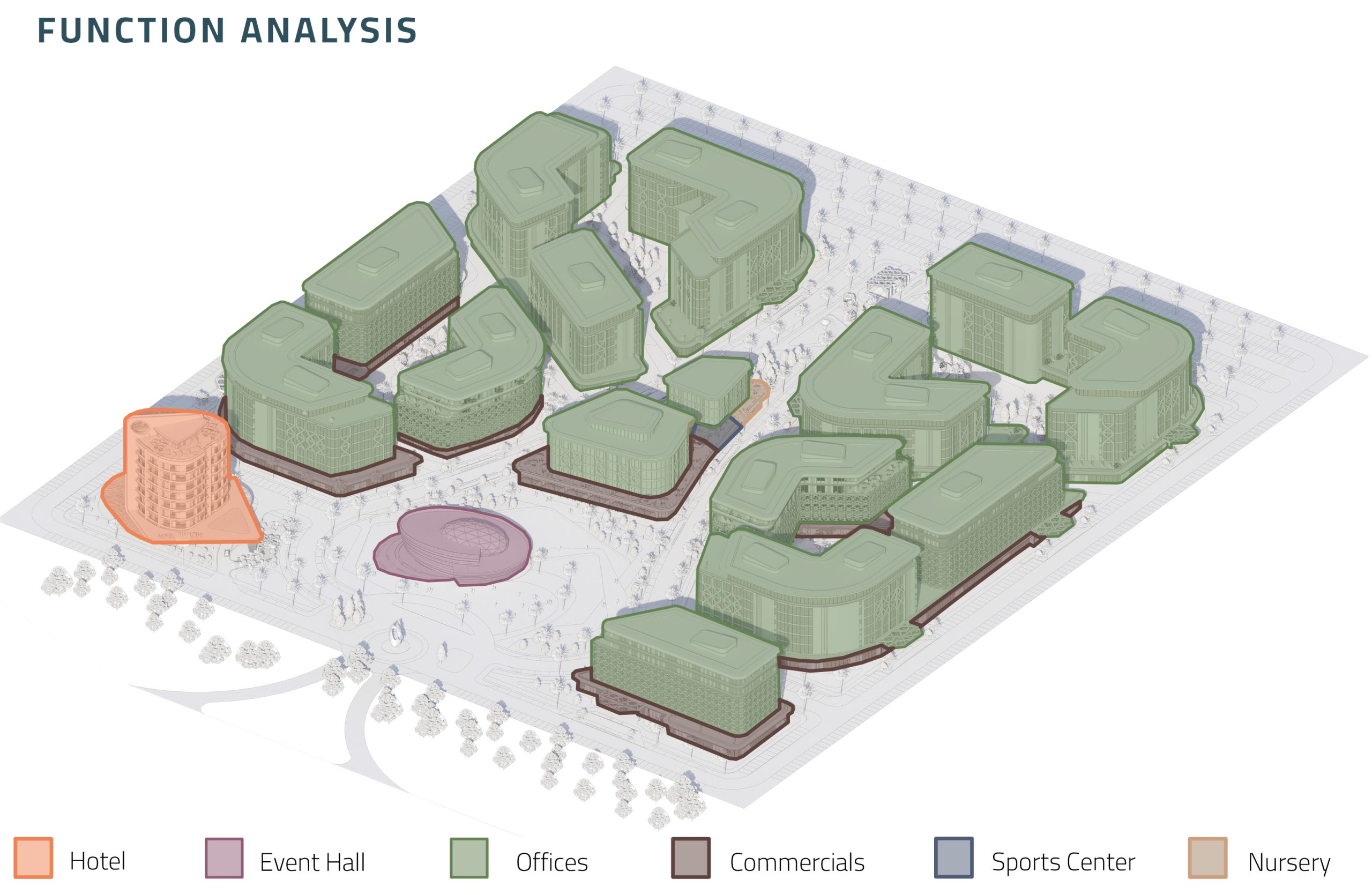 The project is anchored by four core functions: an iconic event hall, office towers, a landmark hotel, and a vibrant retail loop. Complementing these are a sports complex and a nursery, introducing wellness and family infrastructure into the heart of the business ecosystem. Ground-floor commercial functions are wrapped around a series of shaded plazas, activating the site at all hours.