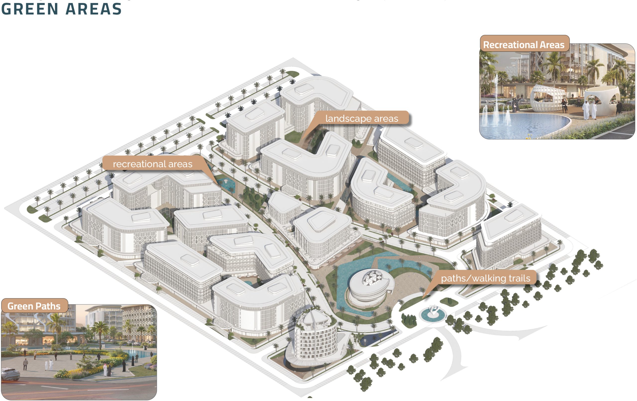 Targeting LEED Platinum certification, the project implements sustainable transport infrastructure, including electric buses, autonomous rail access, and dedicated micromobility paths. Shaded pedestrian corridors, bioswales, solar-integrated roofs, and green courts enhance environmental performance and occupant wellbeing.