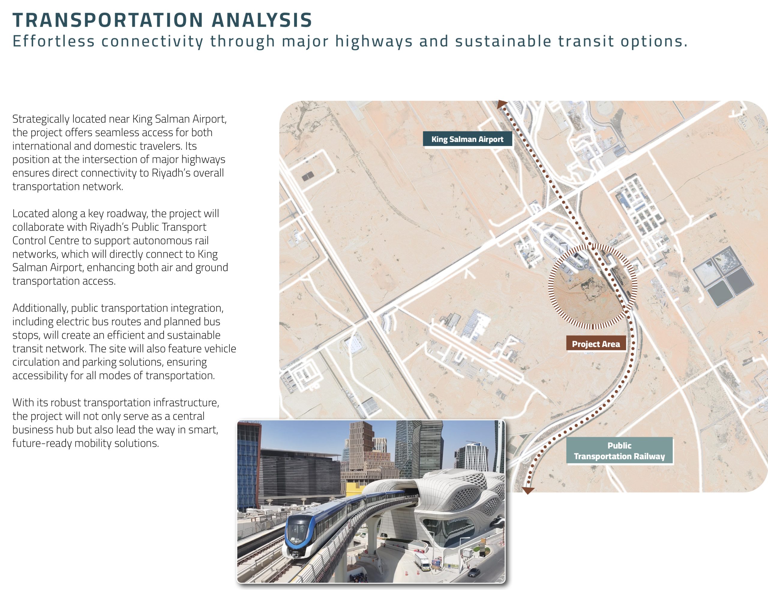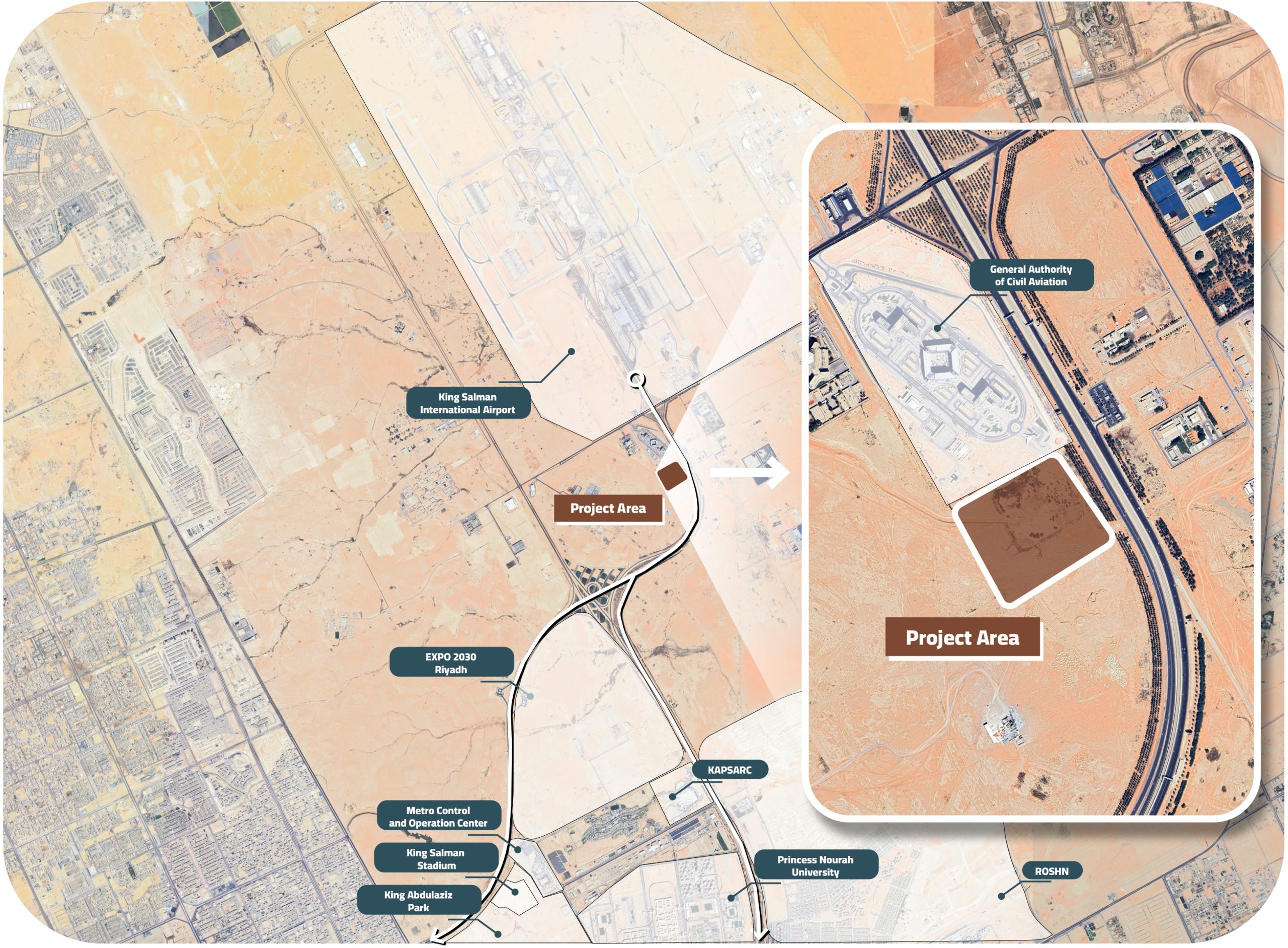 Situated along the primary approach road to King Salman International Airport, the site benefits from high visibility and uninterrupted access. This axial orientation is not only functional it is symbolic. The geometry of the masterplan is organized around a central public void inspired by the faceted form of a diamond, radiating “golden bands” that segment and unite the programmatic zones of the project.