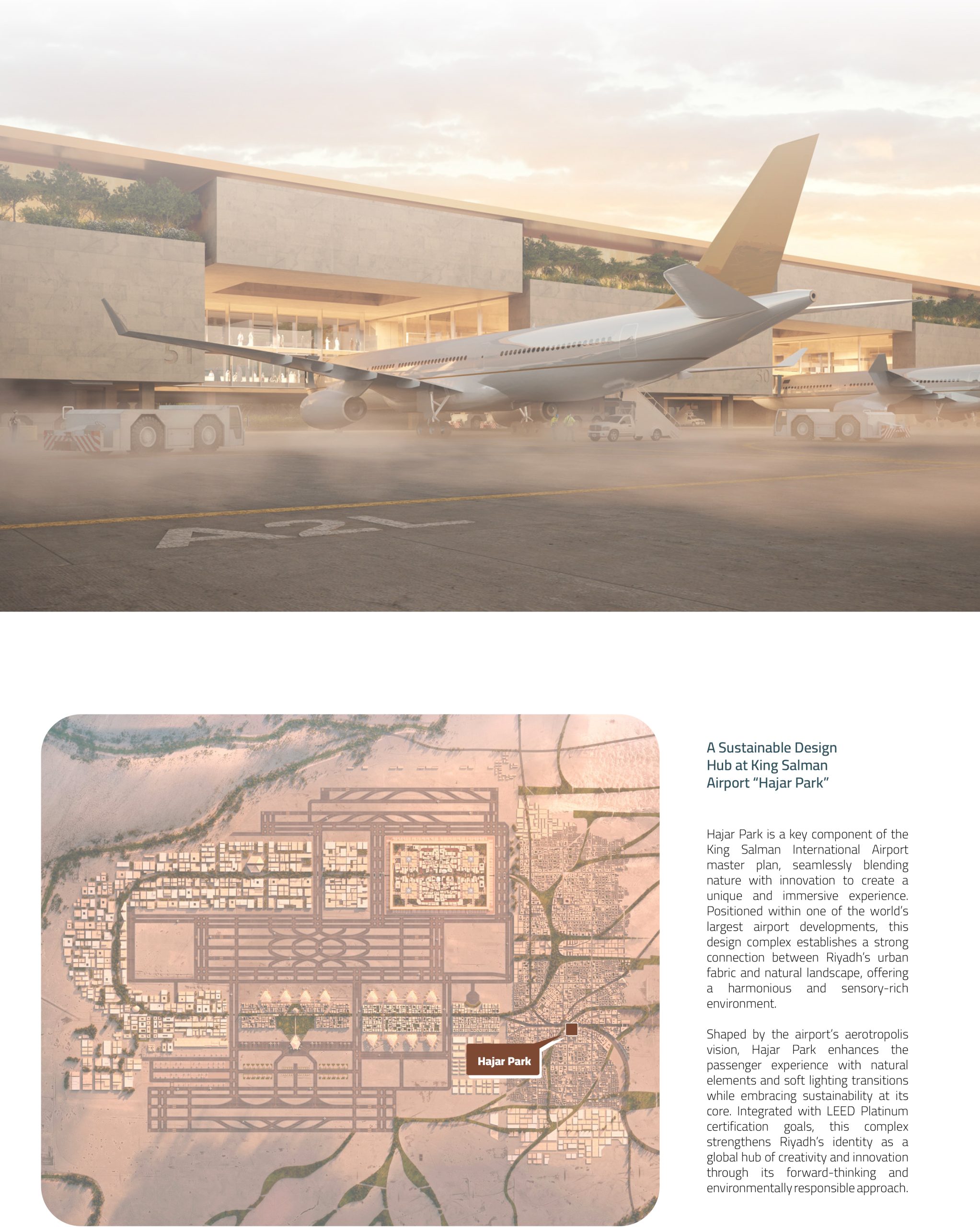 Located within the visionary King Salman International Airport master plan, Hajar Park is designed to serve as a critical connective tissue between Riyadh’s expanding global identity and its ecological and cultural roots. Positioned at a strategic node between major transport corridors, international access points, and civic institutions, the project reimagines what it means to build in the desert proposing a model where climate consciousness, programmatic vitality, and architectural elegance converge.