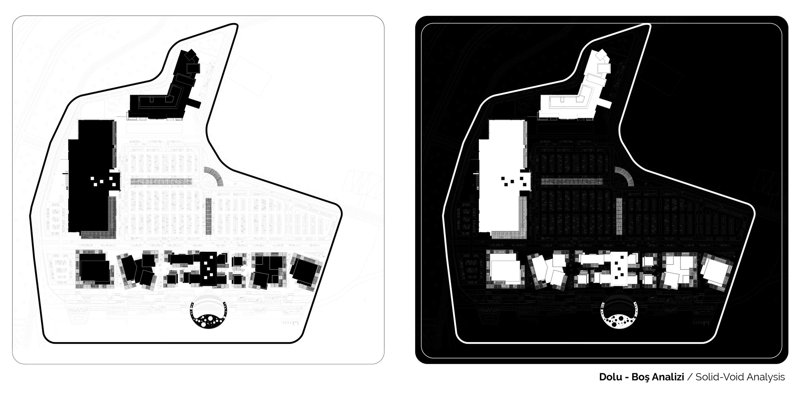 The terrain presents a 10-meter elevation difference along its diagonals, offering a dynamic topographic condition that shapes the spatial organization. The design embraces this gradient by layering public spaces, pedestrian paths, and view corridors in a stepped configuration. Dense tree canopies and vegetation belts are deployed to create microclimates and shade, enhancing user comfort and ecological continuity. These natural systems are complemented by open-air plazas and terraced green roofs that establish a rhythm between built mass and landscape.
