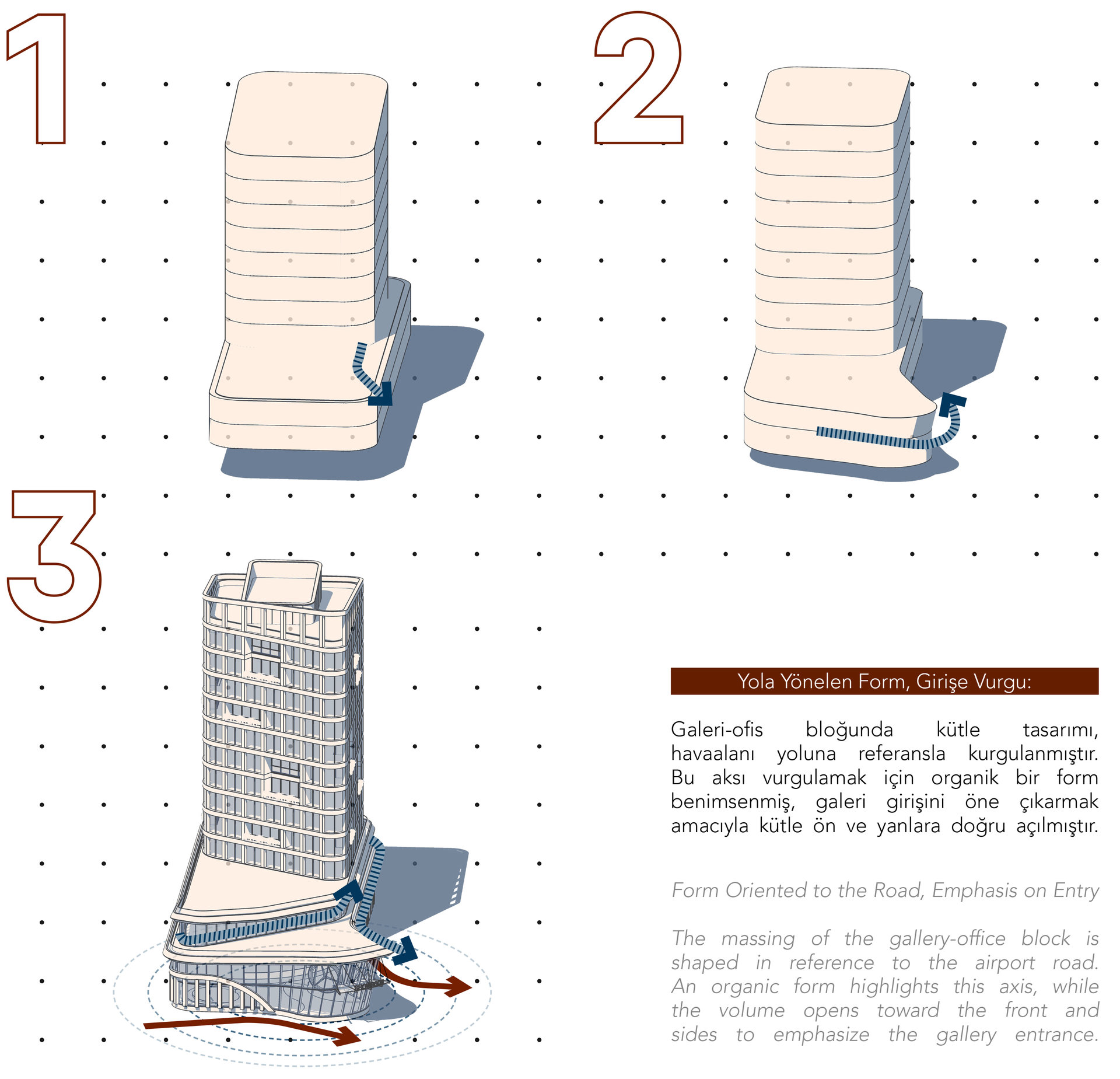 Referencing the adjacent airport road, one of the key orientation lines of the city, the gallery-office block is shaped with an organic massing strategy that responds to the urban silhouette. To emphasize the gallery entrance, the volume expands forward and laterally, creating a visually inviting gesture.