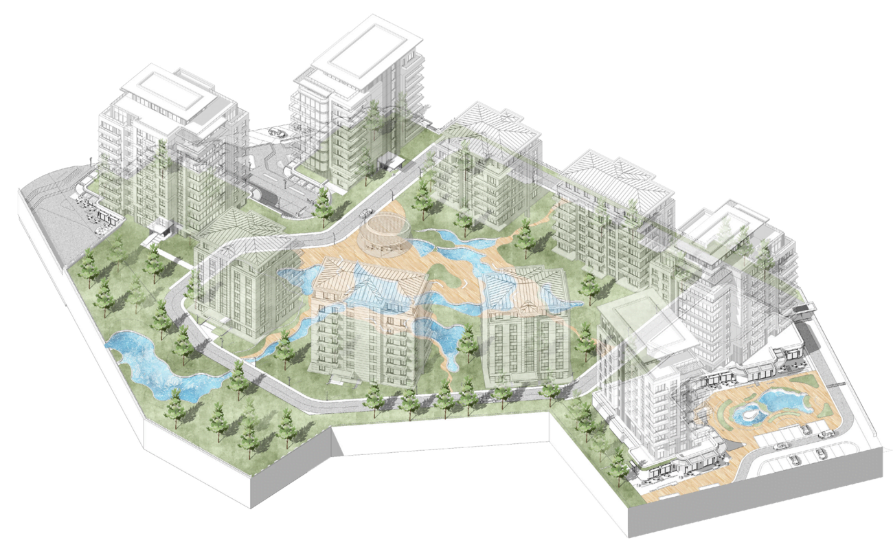 The organic landscape design features green corridors, water elements, and porous hardscape surfaces. Open spaces along commercial streets create vibrant retail fronts, while internal courtyards offer calm and private zones. An allocated park area on-site has been fully integrated into the landscape strategy to support ecological continuity and user well-being.