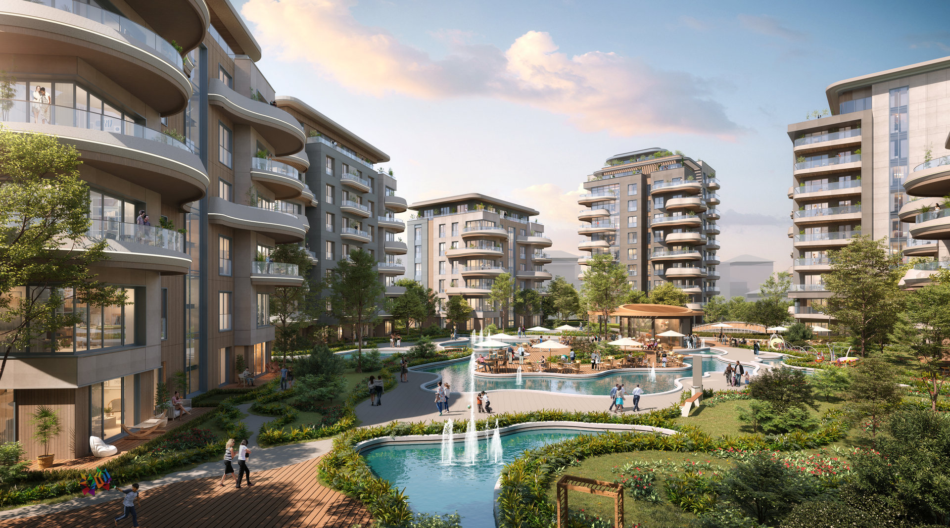 The site planning strategically places commercial squares along the perimeter, drawing energy from adjacent avenues like Çırağan and Alemdağ. High-rise residential towers rise above the commercial podiums along the outer edge, offering expansive views of the forest and city, while low-rise residential blocks facing internal green courtyards cater to family oriented living.
