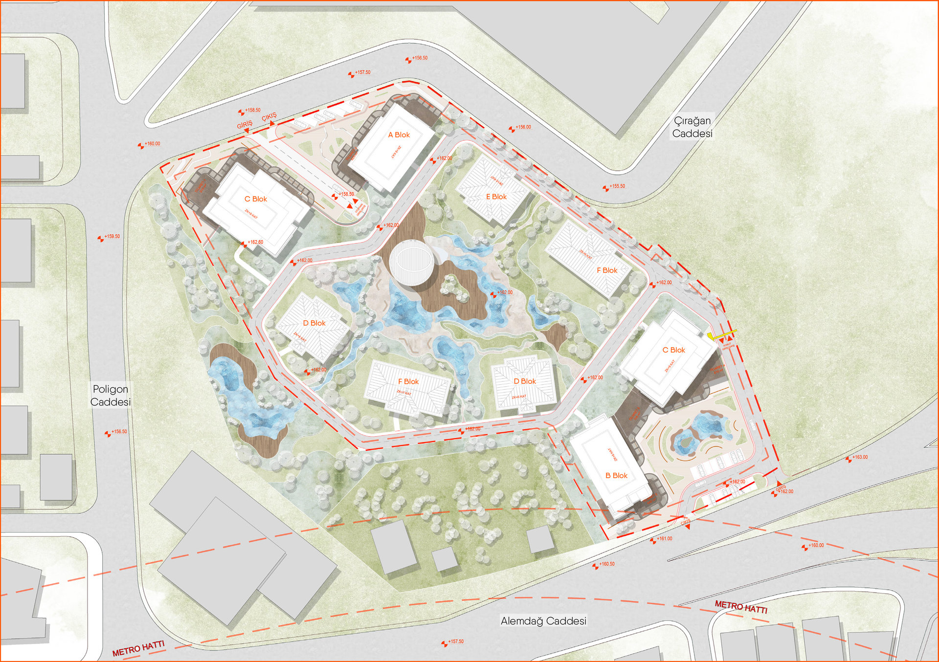The project offers direct connections to public transportation, including the Çakmak Metro Station and multiple bus and minibus routes. Private vehicular access is enhanced by direct links to E-5, the Şile Highway, and the Second Ring Road. The site’s natural topography has been used to provide leveled access: parking entrances are aligned with Çırağan Avenue, while inner vehicular routes are accessed via Alemdağ Avenue.