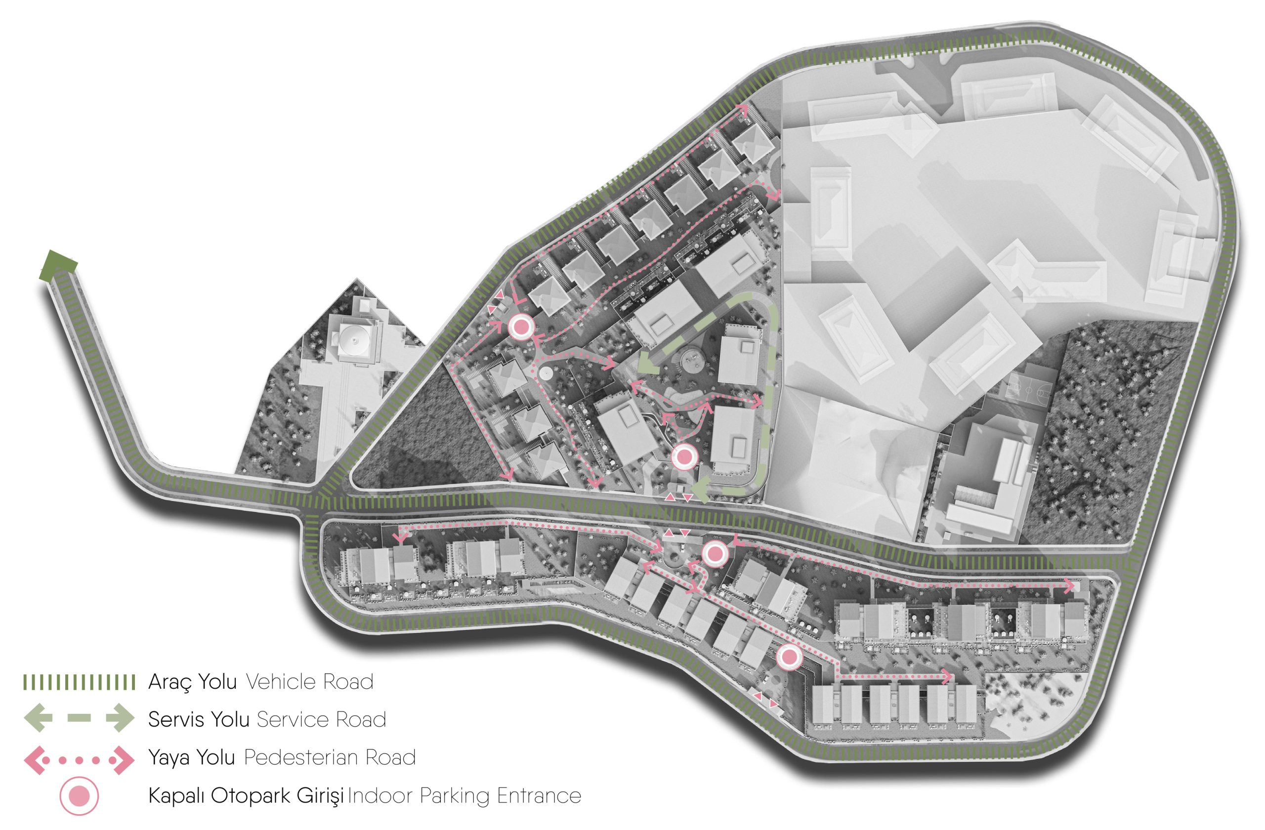 To meet diverse community needs, the masterplan incorporates a primary school, religious facility, and social center. Vehicular movement is confined to the plot perimeter and directed toward underground parking, resulting in a pedestrian oriented internal circulation. This layout reinforces the project’s commitment to walkability, ecological continuity, and neighborhood integration.