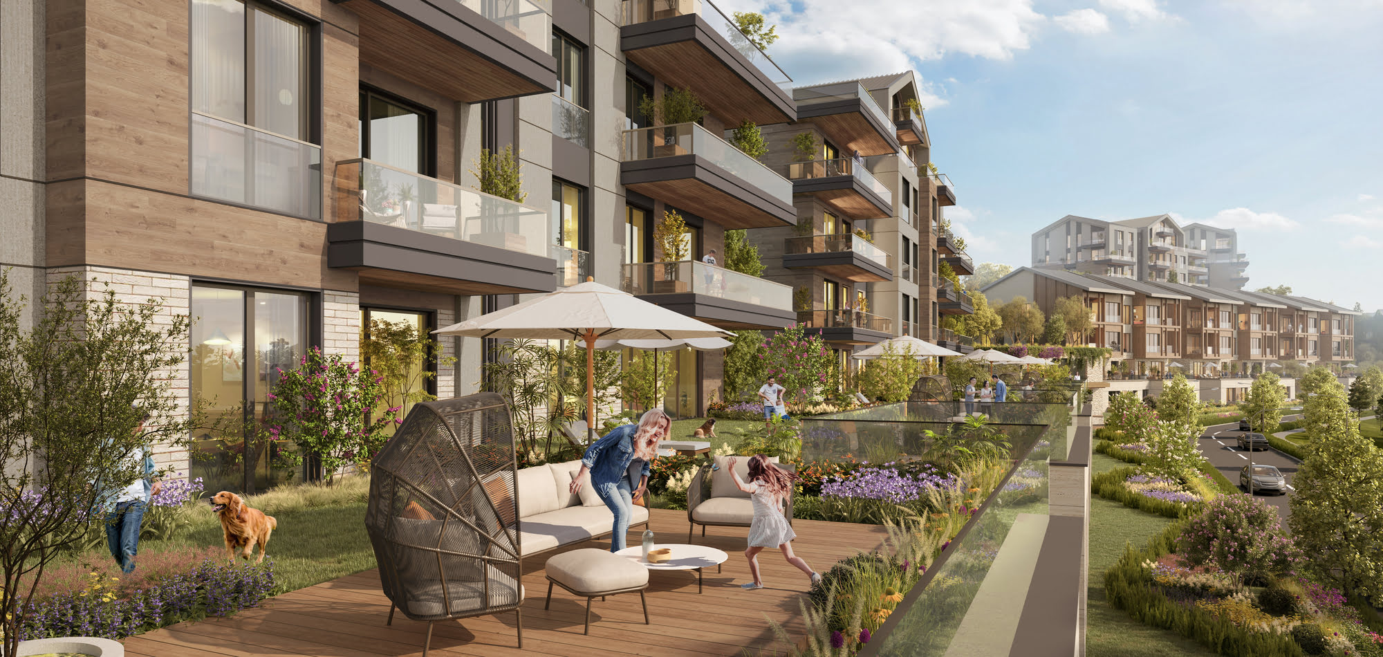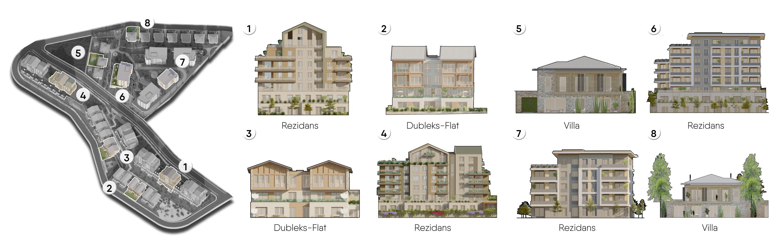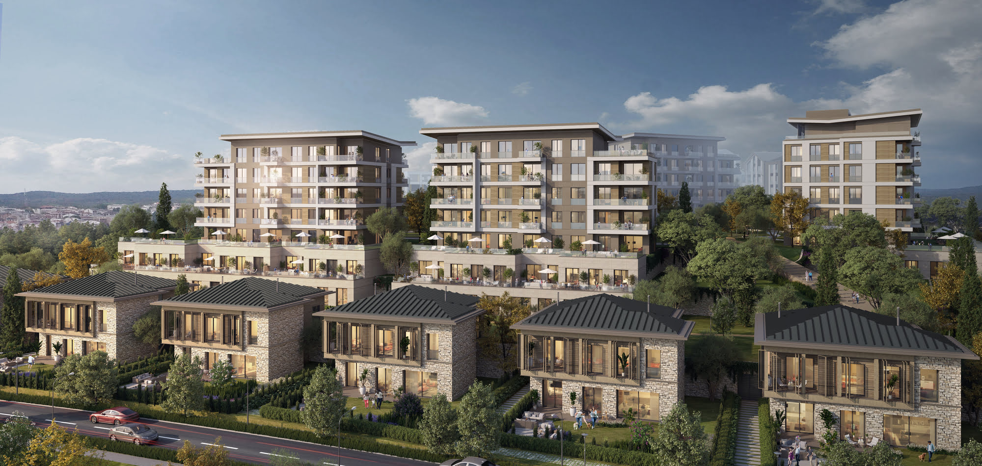 The project comprises villas, duplex flats, and mid-rise residences arranged in a stepped layout that follows the site’s natural topography. This design strategy minimizes visual obstruction, enhances privacy, and allows for maximum shared green space across the site.
