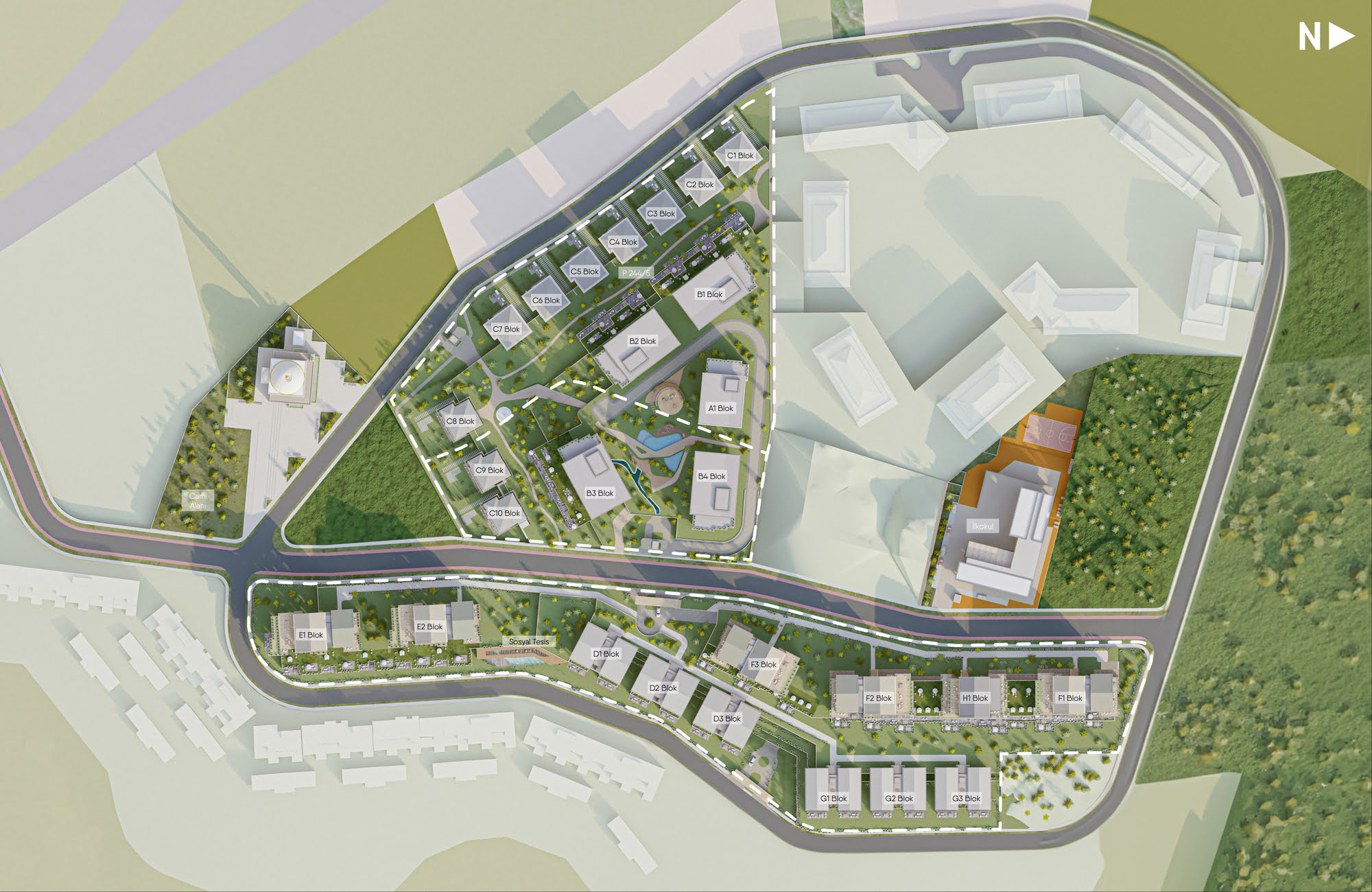 Set within the evolving northern periphery of Istanbul, the Mesa Kemerburgaz Residential Complex is situated between Göktürk and Kemerburgaz metro stations, establishing a visual and contextual relationship with the historical Kemerburgaz Aqueduct. The site unfolds along the Hasdal–Kemerburgaz Road, integrating itself into the broader urban spine of the region.