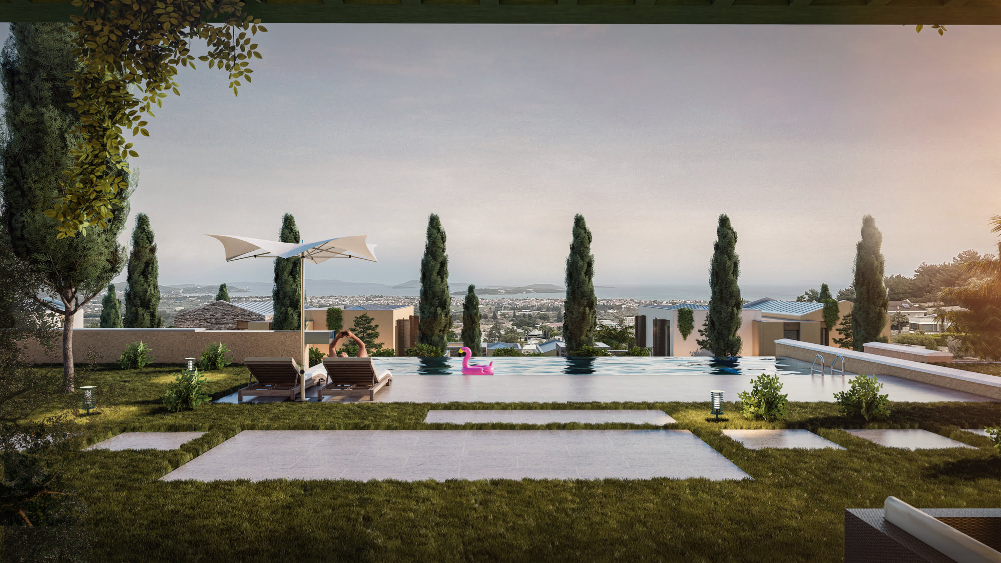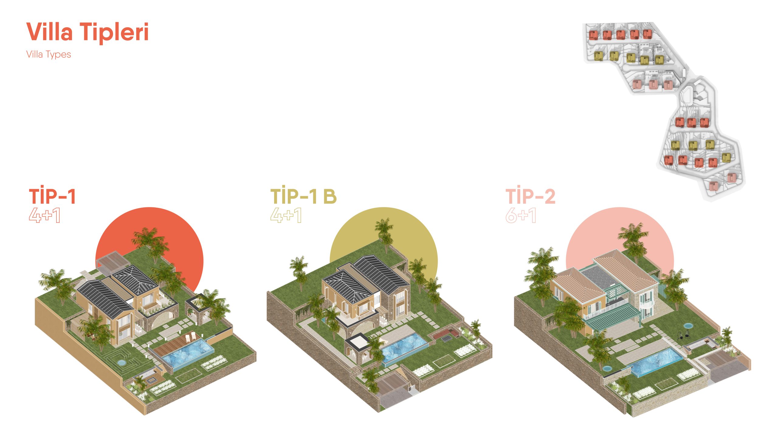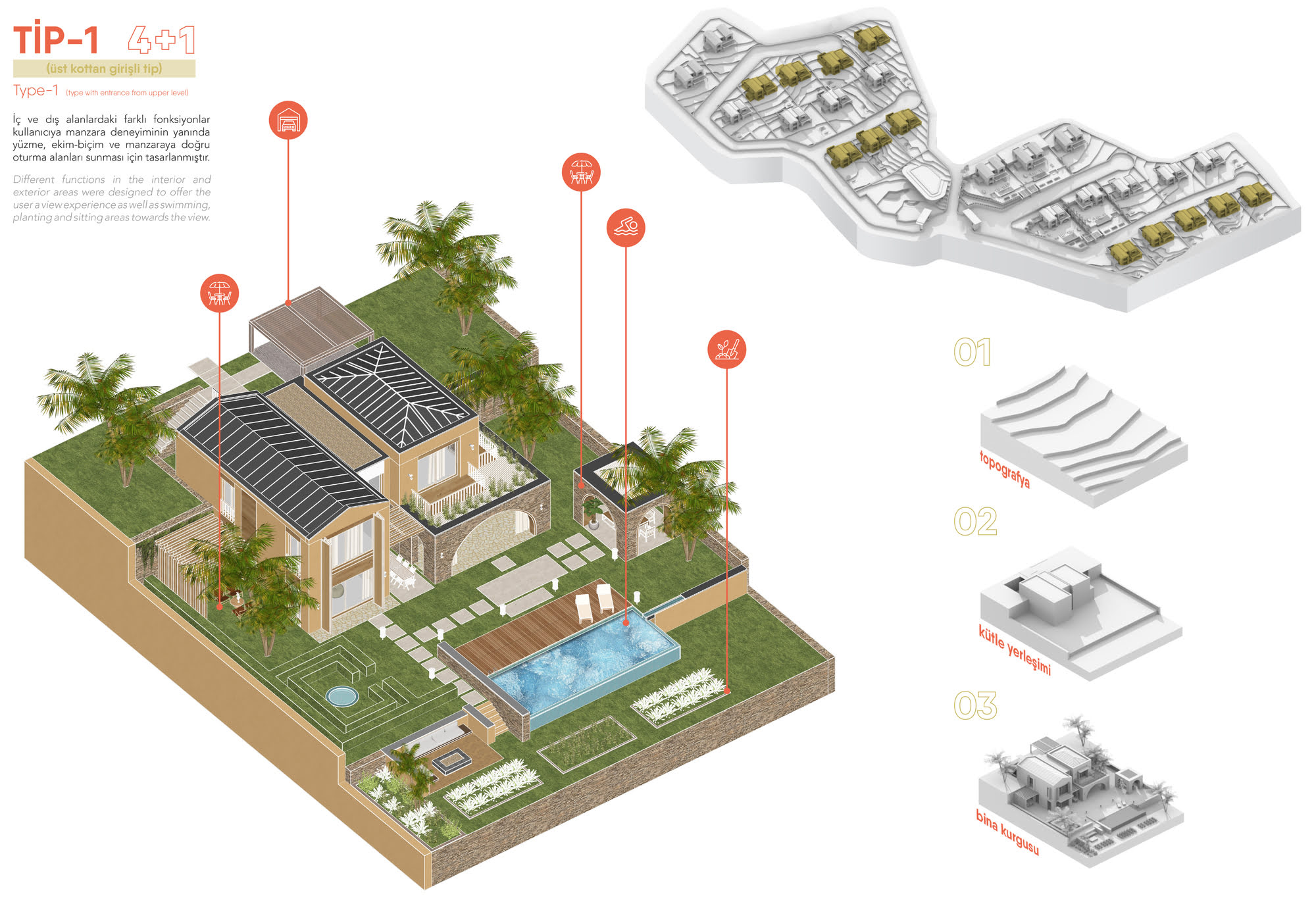 Both indoor and outdoor functions are shaped around the dual aim of maximizing the landscape experience and offering diverse spatial opportunities. Swimming pools, farming and cultivation terraces, and seating areas directed toward the panorama enrich the living environment. Within the residences, functions are carefully adapted to the site’s potentials. Spaces revealed by elevation differences are designed as garages or additional living areas, adding both practicality and value.