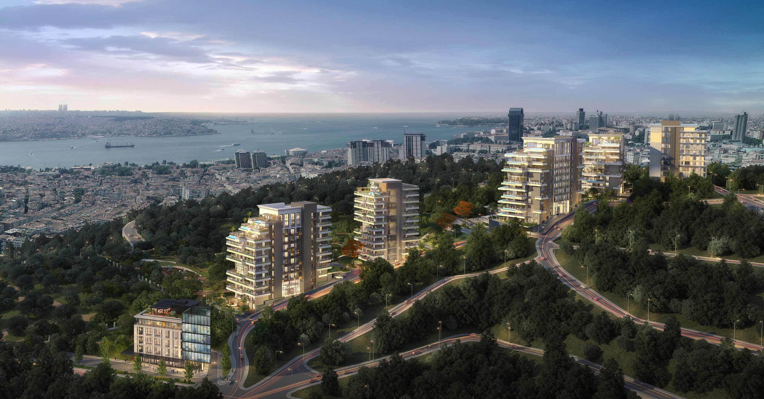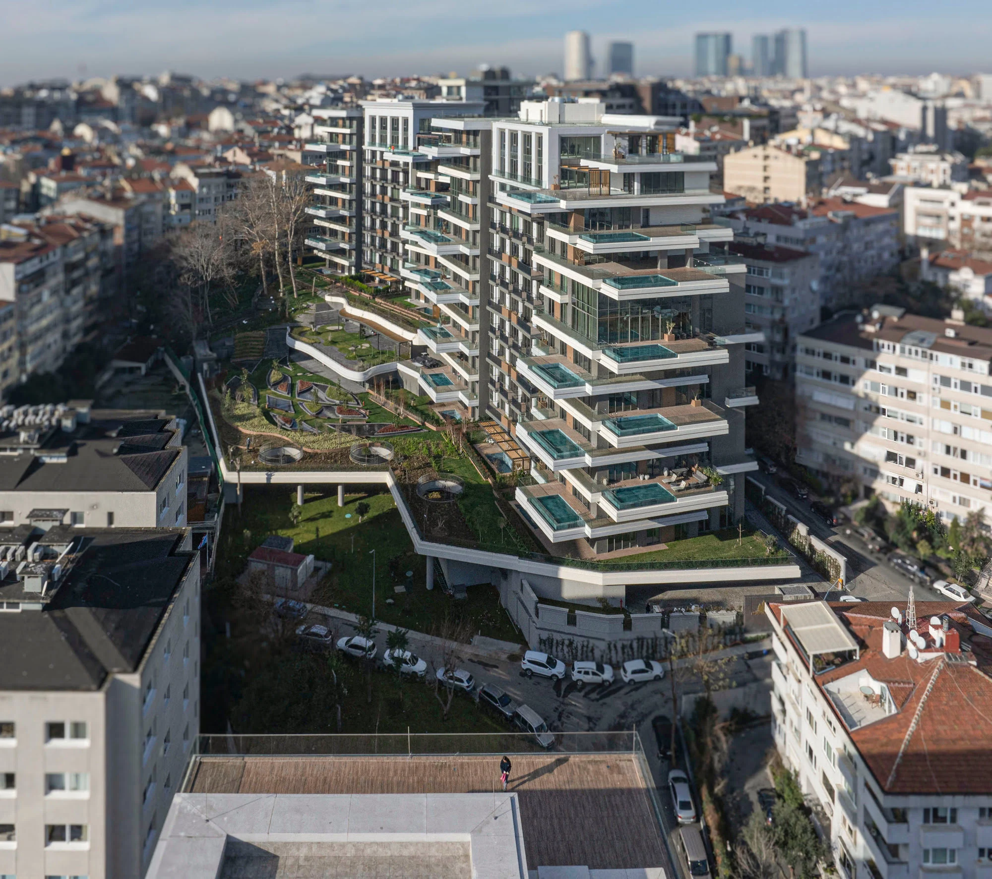 The project sits atop a steeply sloped site in Beşiktaş’s Teşvikiye quarter surrounded by preserved landmarks such as the historic Ihlamur Pavilion and adjacent urban green pockets. Rather than resist the topography, the masterplan adopts it as a design driver. Building volumes are calibrated to the terrain through stepped massing strategies, ensuring maximum view exposure and a reduced urban footprint.