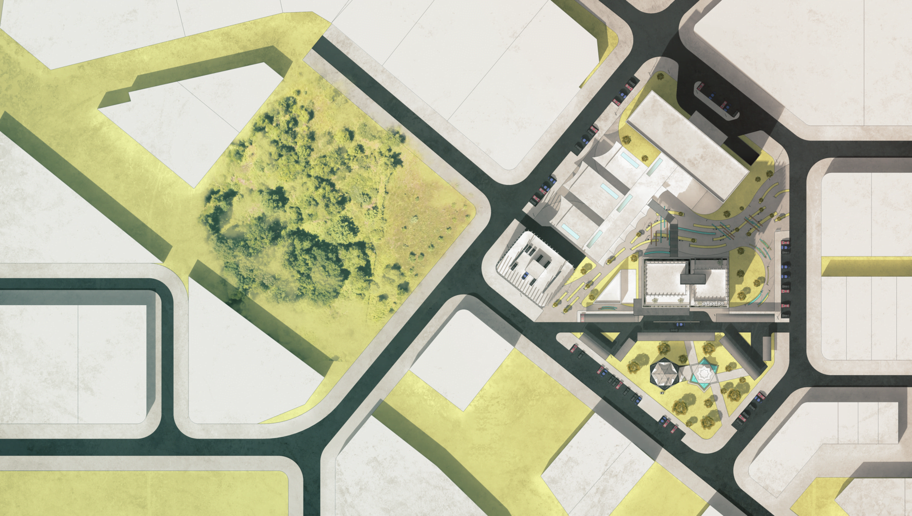 A strategic emphasis is placed on preserving and enhancing the southern portion of the site for a mosque, supporting the spiritual and communal needs of users. Surrounding this central anchor, the master plan introduces complementary functions such as a hotel, auditorium, conference halls, and a small scale market. These additions aim to reinforce the commercial identity of the zone while improving service quality and enhancing the daily life of users within the broader industrial context.