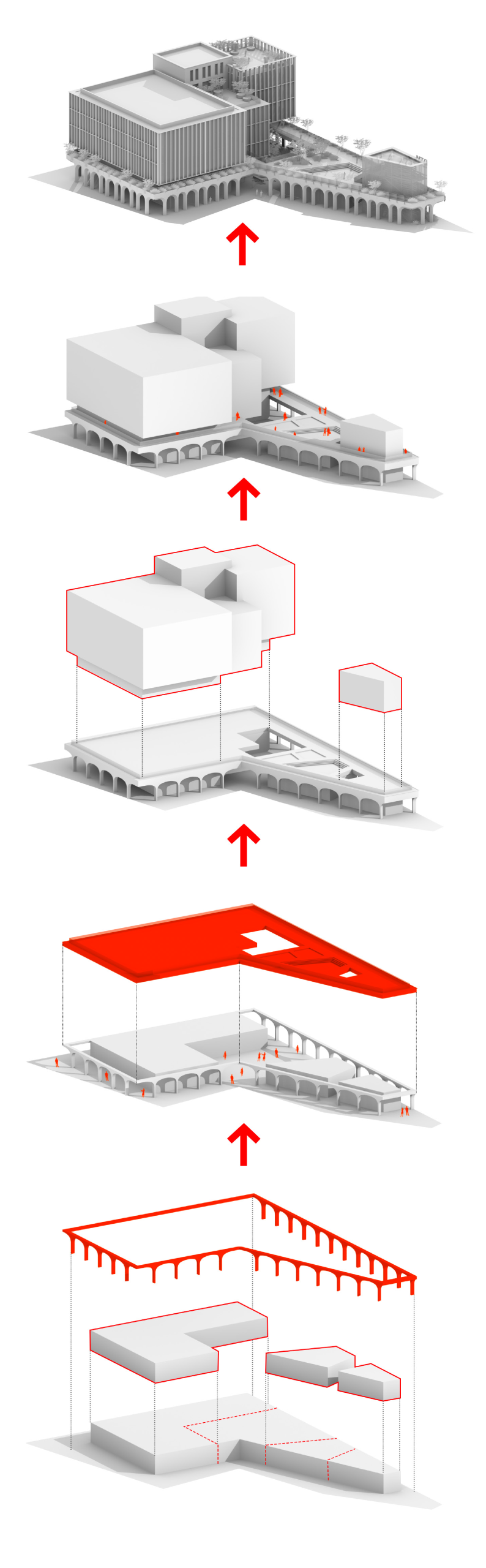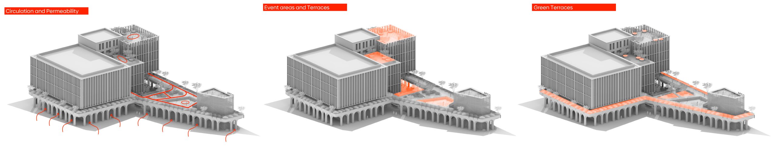 The fragmented volumetric composition of the building is informed by two primary objectives: to preserve the silhouette and view of the historic Liman Han located immediately behind the site, and to ensure that the building’s scale remains compatible with the skyline of the Historic Peninsula. In response, taller volumes are positioned adjacent to the ITO Building, while a permeable and lower ground-floor base with arched colonnades supports the upper mass. Public and semi open spaces are embedded into the ground level, referencing the urban passages of Sirkeci.