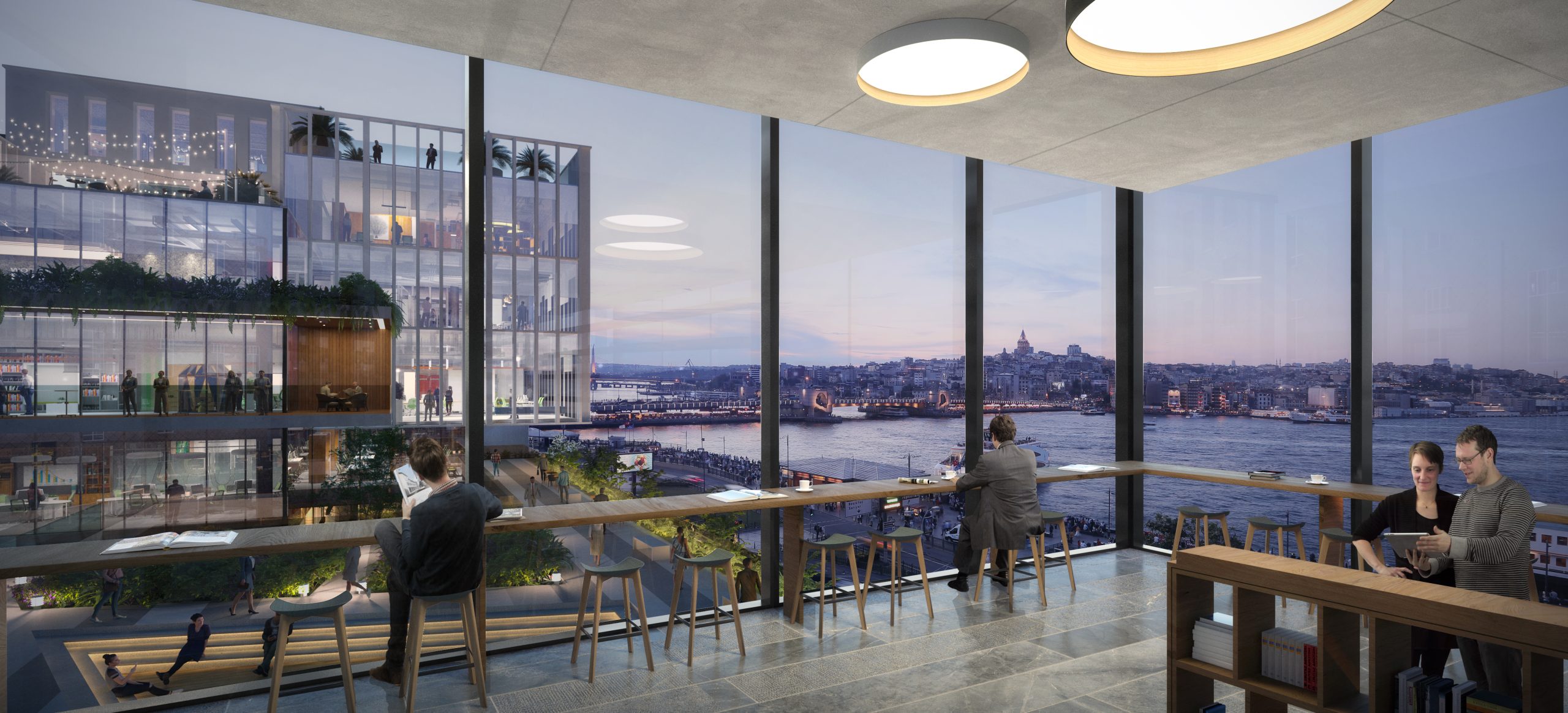 Taking advantage of its proximity to the Bosphorus and Haliç, the building is articulated with terraces, large openings, and transparent façades to frame key landmarks such as the Galata Tower and Bridge. An elevated rooftop terrace functions as a landscaped extension of the workspaces and library, ensuring uninterrupted visual access while bypassing infrastructural obstacles like roads and tramlines at ground level.