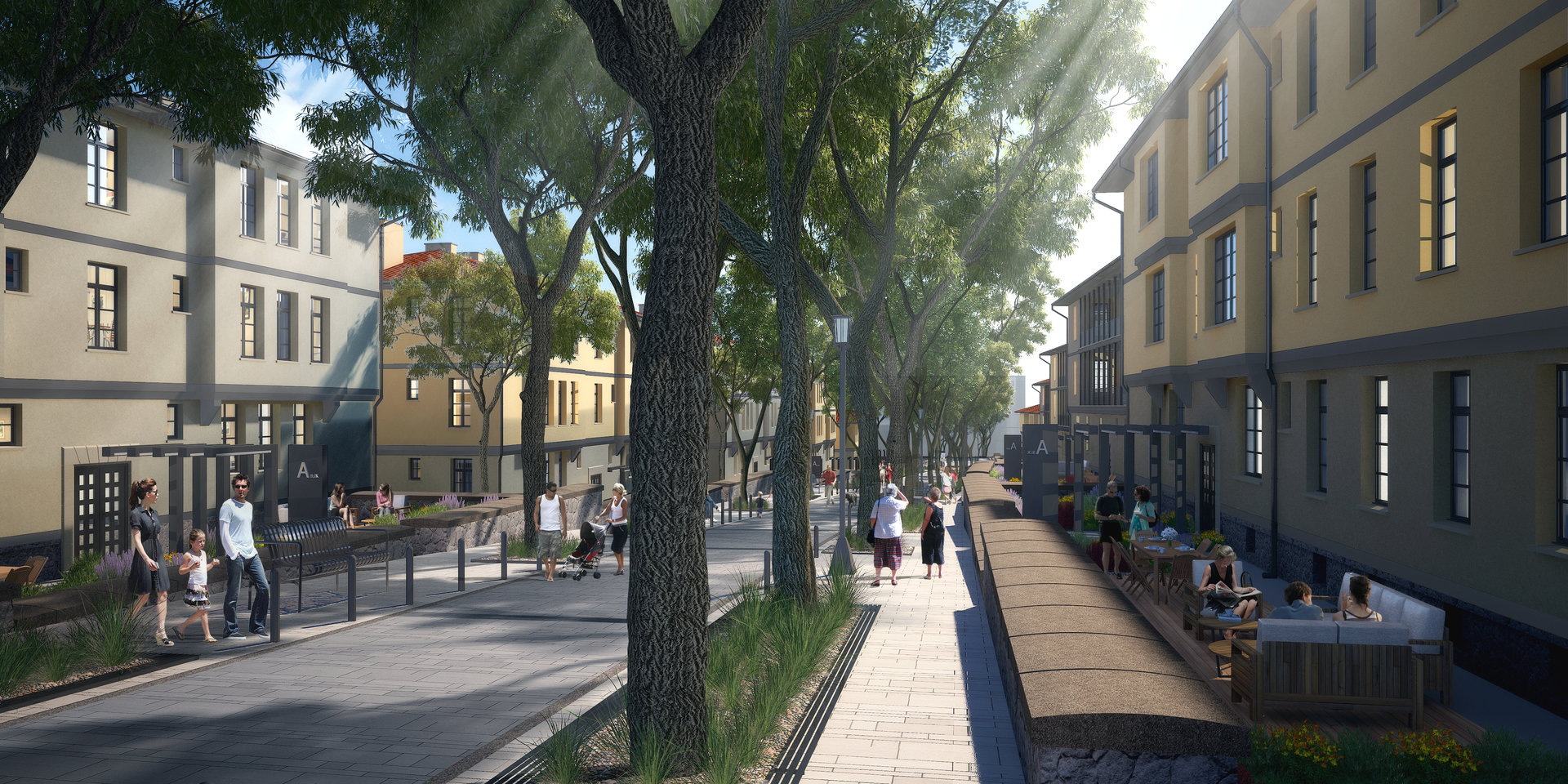 Public recreation areas extend between buildings and private gardens, enabling visual openness and informal social interaction. The revitalized layout fosters a renewed sense of neighborhood belonging, reinforcing both collective memory and everyday use.