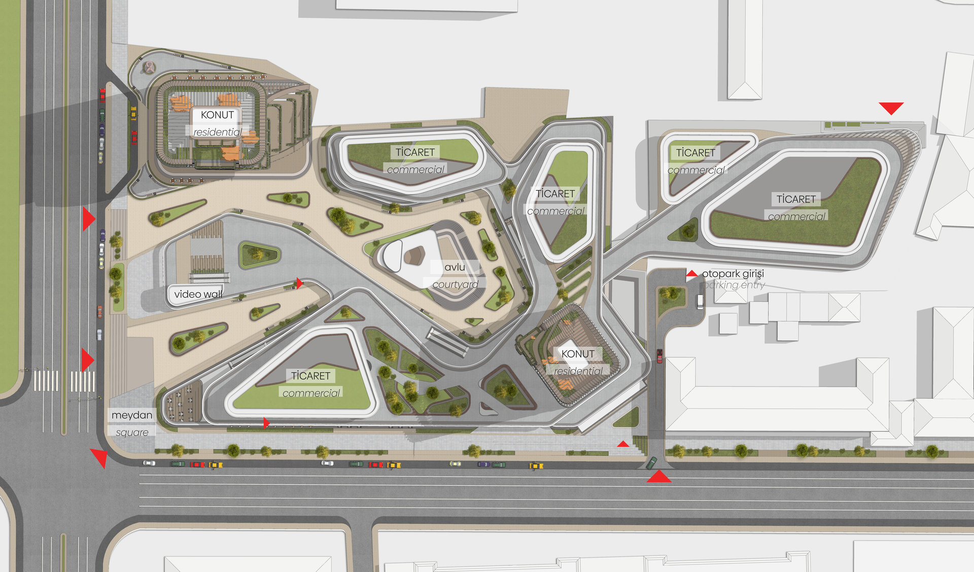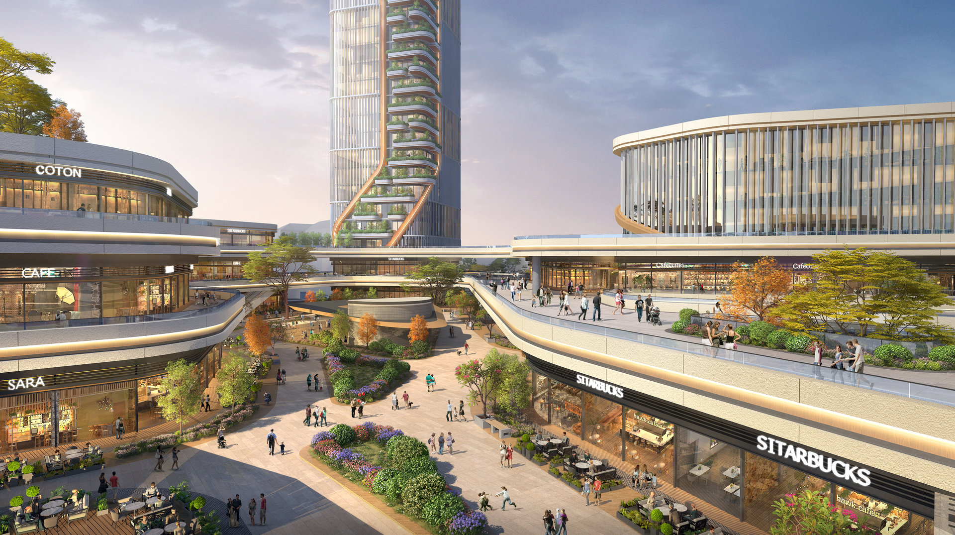 The massing strategy draws inspiration from canyon topographies, creating voids and terraces that carve out spatial drama between residential and commercial blocks. Designed around an open-air retail concept, the project merges organic movement patterns with a permeable pedestrian network, inviting users deep into the site via a landscape-led choreography.