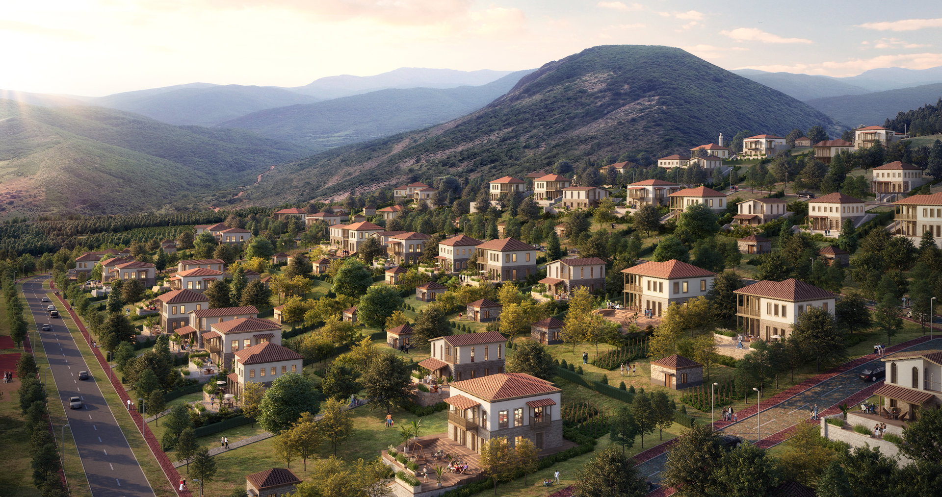 The design respects the mountainous relief of the region, with elevations ranging from 500 to 1,770 meters. Residential zones are situated to optimize landscape views, sun exposure, and natural ventilation based on three key parameters: topography, existing road access, and visual corridors. The climate, characterized by hot dry summers and mild winters, is integrated into passive design strategies that shape the orientation, ventilation, and shading systems of built forms.
