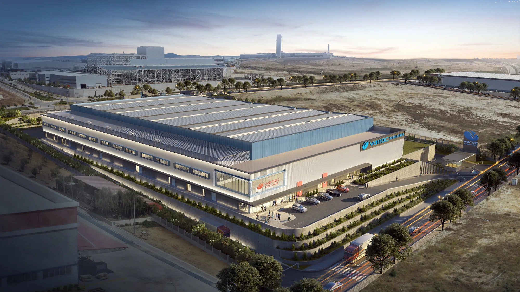 Located in one of Turkey’s leading industrial zones, the Varroc Gebze Factory sits on a 28,000 m² site and stands as a contemporary facility combining efficiency, technology, and design clarity. The architectural language emphasizes clean industrial lines, with a focus on functionality, accessibility, and visual identity. The transparent main volume, labeled “Excellence,” highlights the company’s innovative and forward-looking production vision. The site organization ensures smooth logistics and employee access, while landscape elements and leveled terraces create a strong connection between the structure and its surrounding topography.