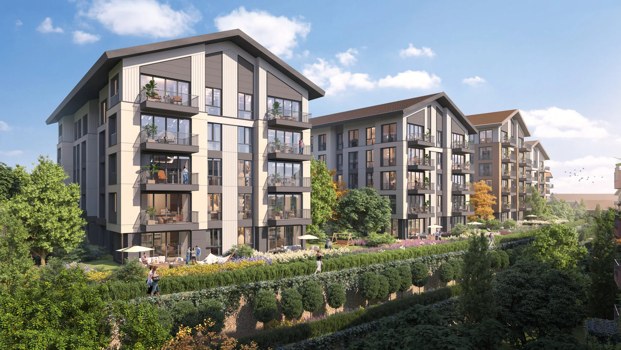 Bloklar arası boşluklarda tasarlanan iç avlular, spor alanları, oyun bahçeleri ve dinlenme alanları; komşuluk ilişkilerini güçlendiren bir sosyal doku üretir.