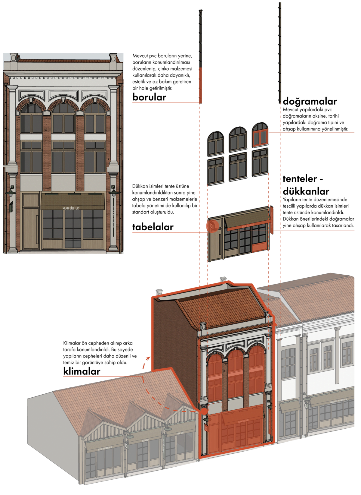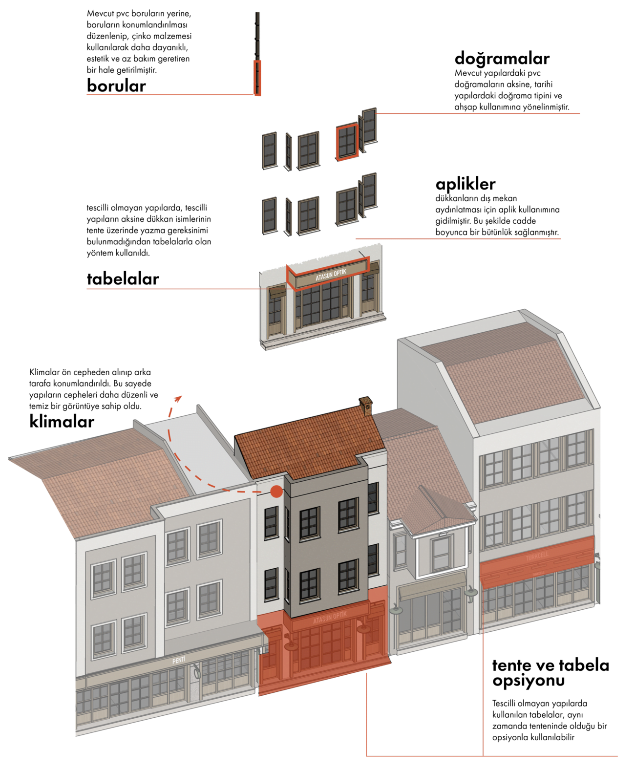 Cephe tasarımında, dağınık ve görsel kirlilik oluşturan tüm unsurlar sadeleştirilmiştir. Dükkan adları ahşap tentelerin üstüne alınmış, çinko boru sistemleri ile altyapı düzenlemeleri uzun ömürlü ve görsel uyumlu bir forma büründürülmüştür. Tüm detaylar, tarihi dokuyla malzeme ve oran açısından uyum içerisinde ele alınmıştır.
