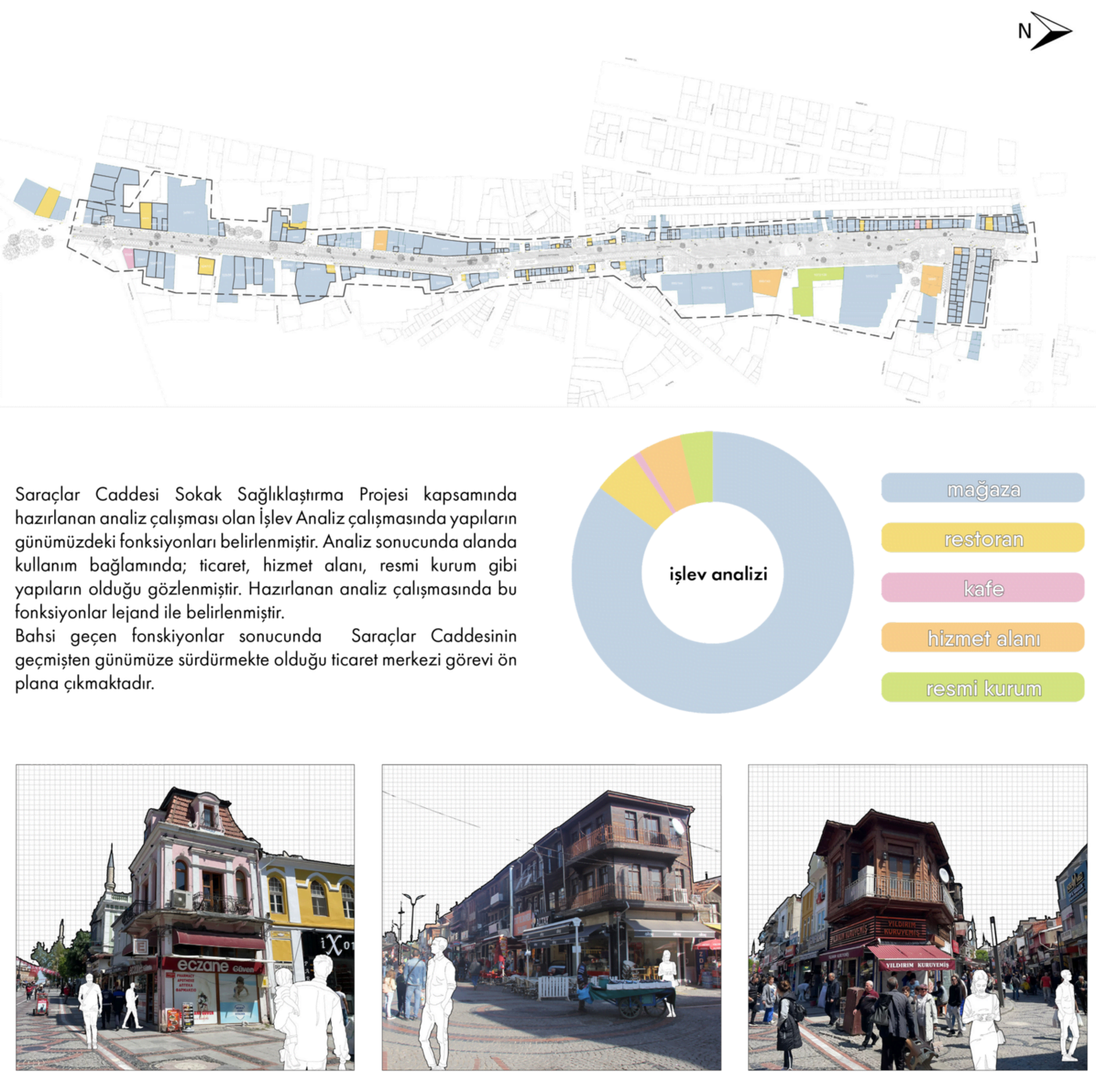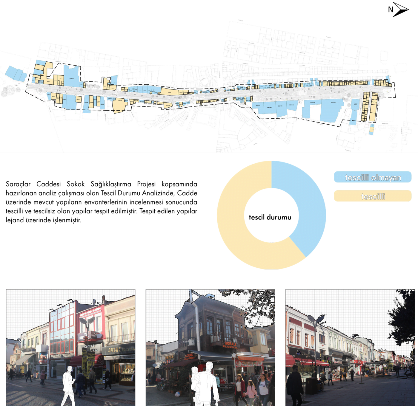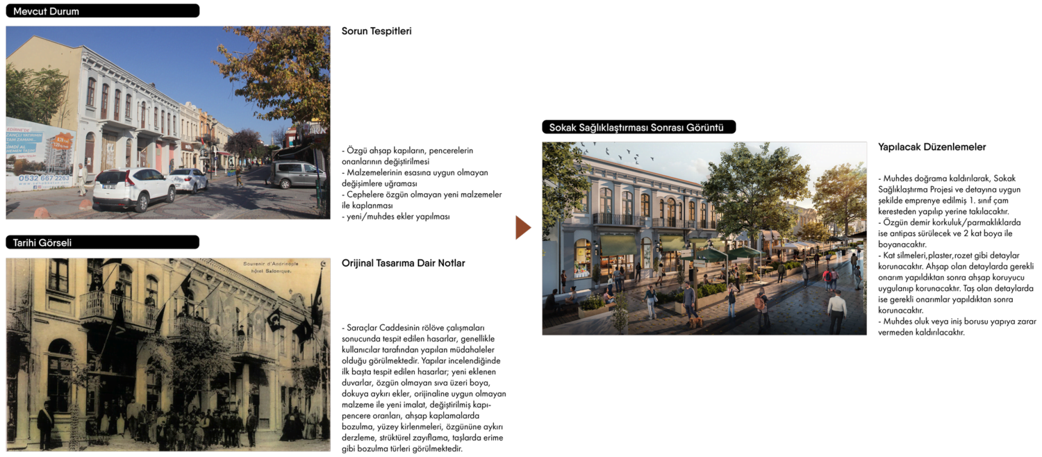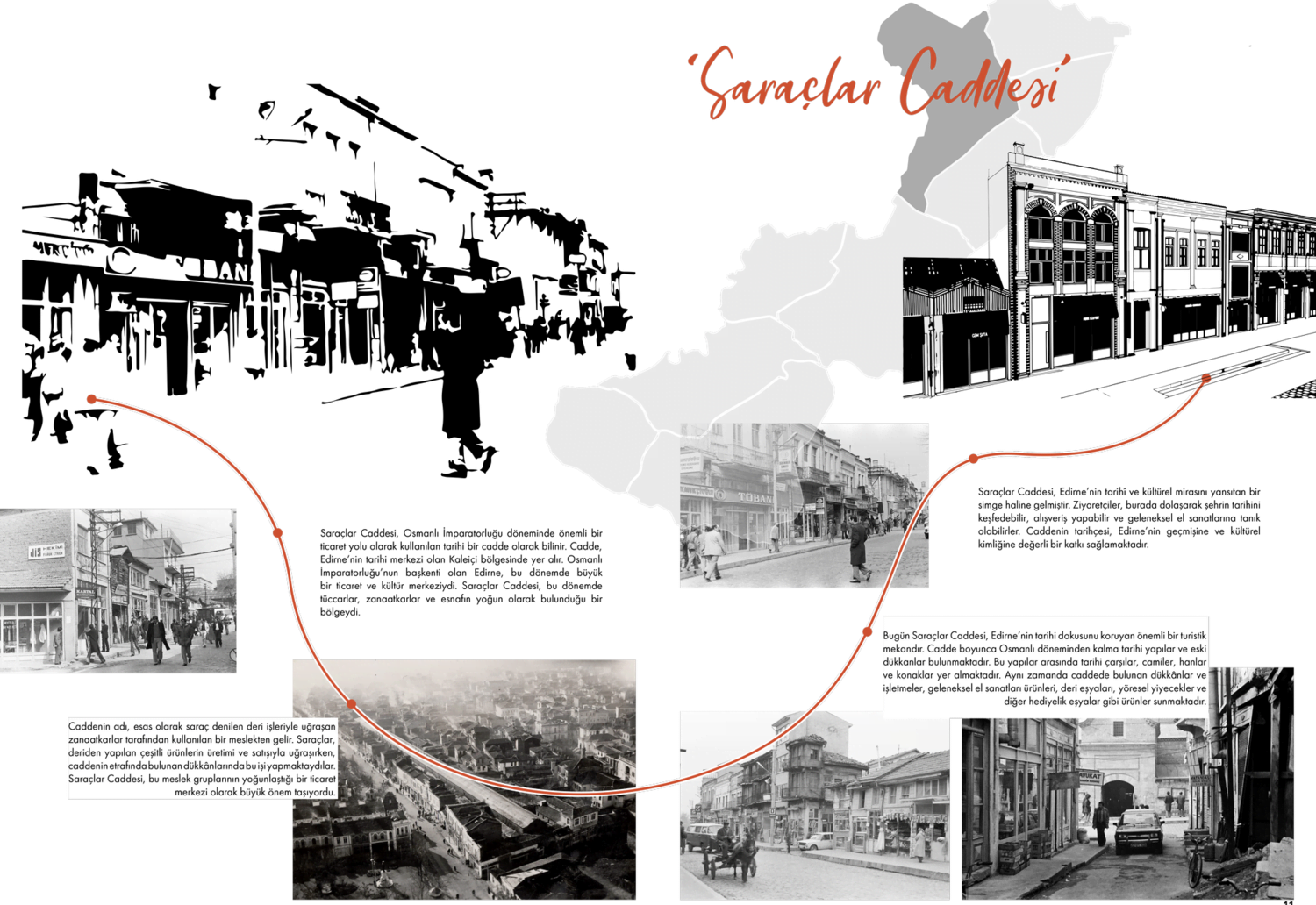 Edirne’nin tarihi Kaleiçi bölgesinde yer alan Saraçlar Caddesi, 16. yüzyıldan bu yana ticaret ve sosyal yaşamın odak noktası olagelmiştir. Roma İmparatoru Hadrian döneminde inşa edilen ve bugün var olmayan doğu suruna paralel uzanan bu 700 metrelik eksen, ticari işleyişin ve kentsel belleğin taşıyıcısıdır. Sağlıklaştırma projesi, bu sürekliliği koruyarak caddenin çağdaş kamusal yaşama adapte edilmesini hedeflemektedir.