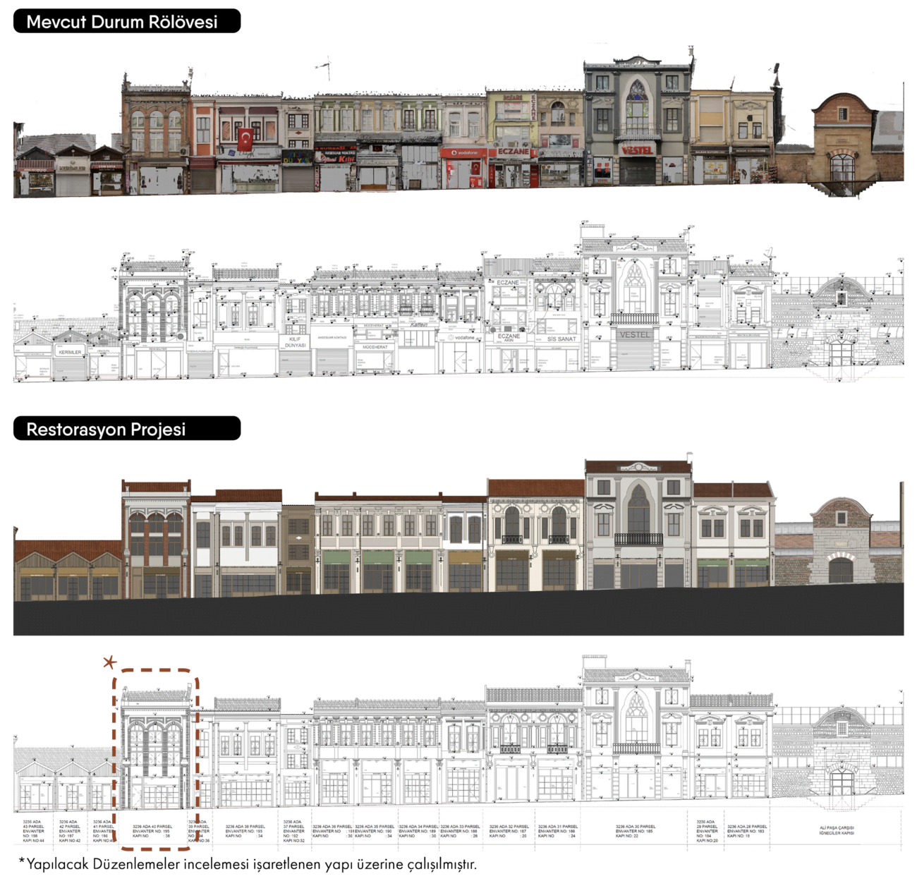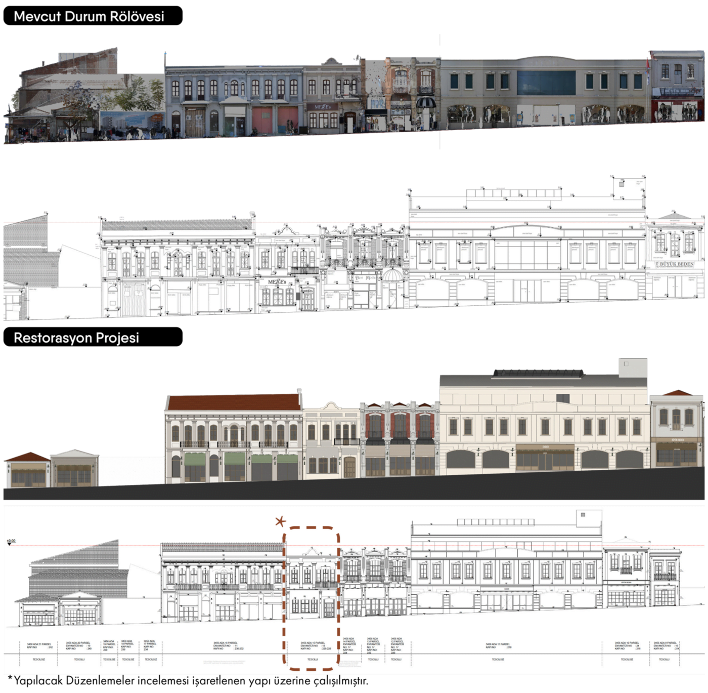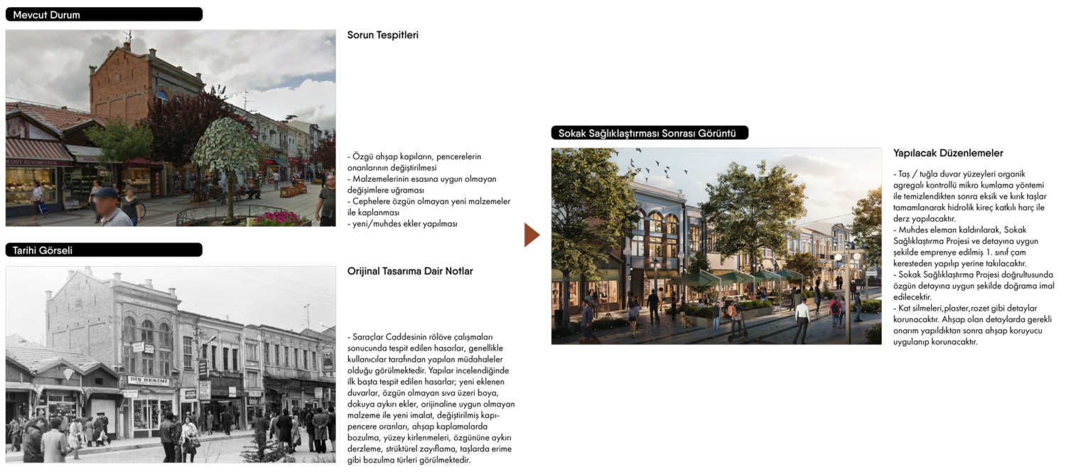 Alan içerisindeki 94 adet tescilsiz yapıya, tarihi çevre ile çatışmayan ancak çağdaş bir yorumla düzen getiren bir müdahale stratejisi uygulanmıştır. Ahşap doğramaların yeniden yorumlanması, klimaların gizlenmesi, tabela ve aydınlatma düzenlemelerinin standardizasyonu gibi kararlarla cephe bütünlüğü sağlanmış; karmaşa azaltılarak caddenin genel estetik dili güçlendirilmiştir.