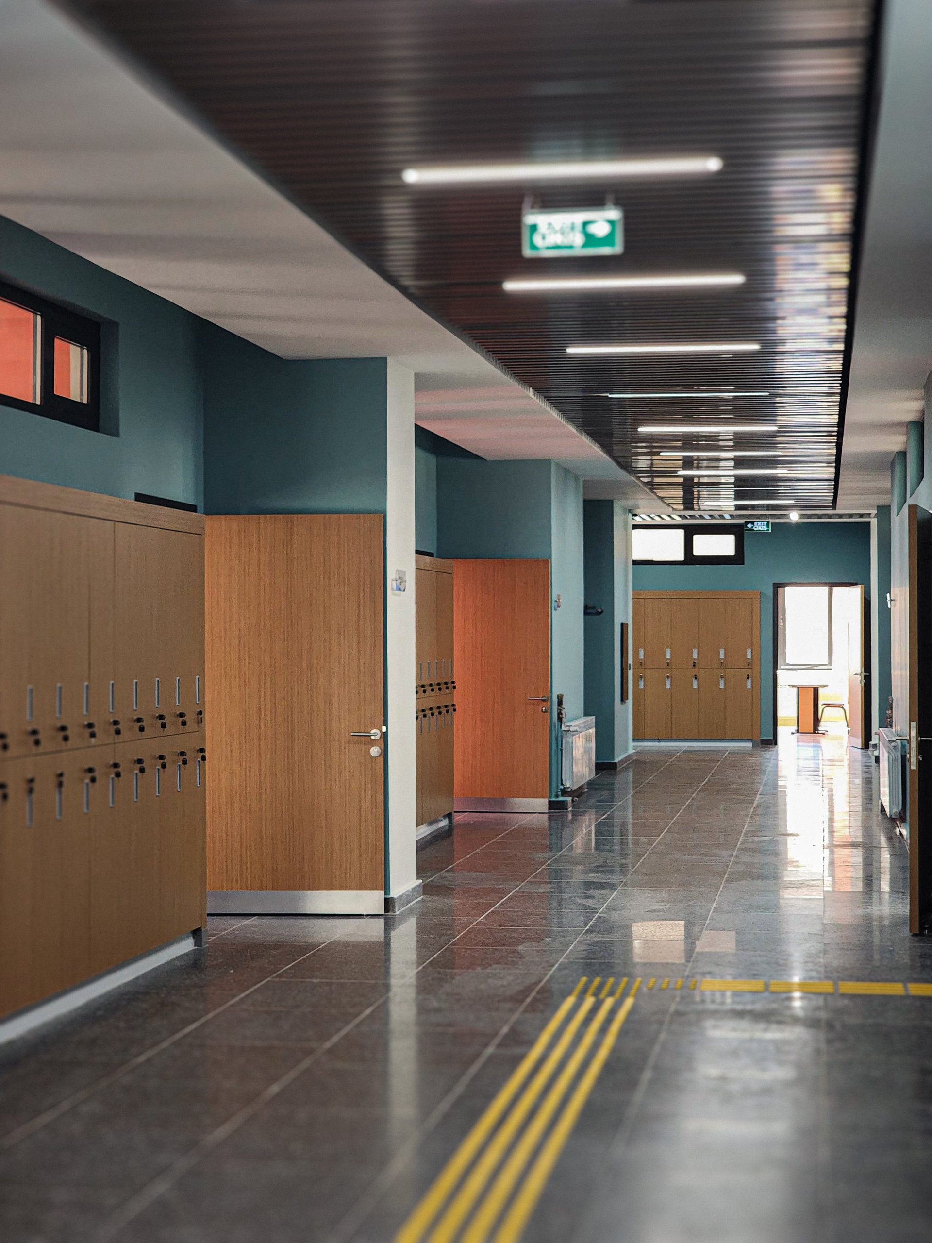 Okul bahçesi, doğal çevreyle etkileşim kurma imkanı sağlayan yeşil alanlarla çevrilmiş olup, açık hava öğrenimini teşvik edecek şekilde planlanmıştır. Geniş sosyal alanlar, çocukların birbirleriyle etkileşim kurarak kişisel gelişimlerini desteklerken, öğretmenler için tasarlanan seminer salonları ve çalışma alanları nitelikli bir eğitim ortamı yaratmaktadır.