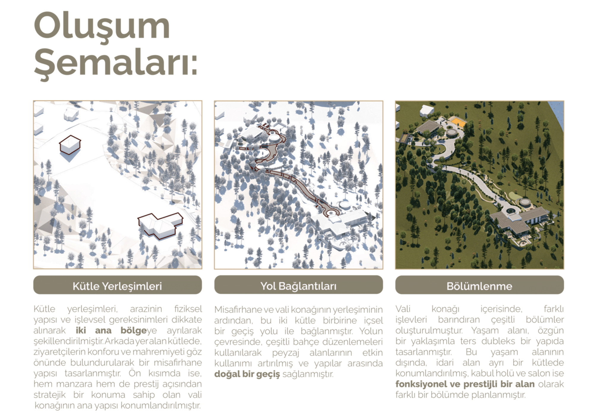 Vali konağı, mahremiyeti öncelikleyen ters dubleks bir kurgu ile tasarlanmış, misafirhane ise arka kotta konumlandırılmıştır.