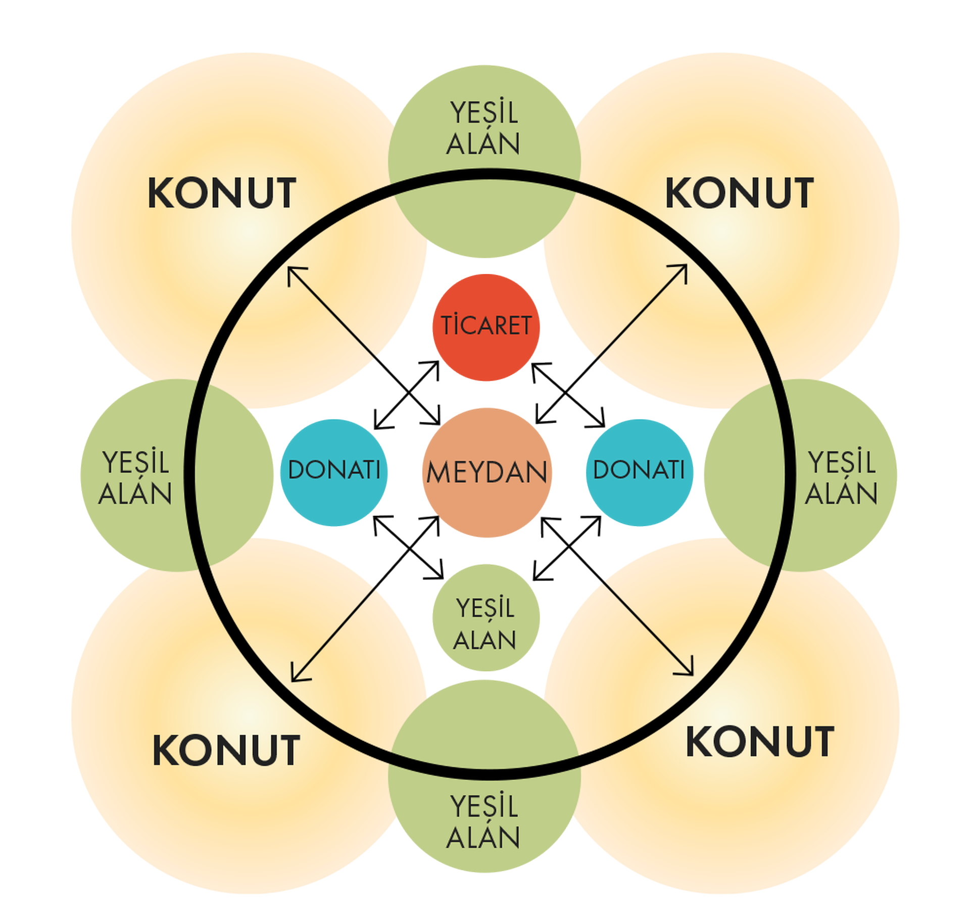 Kendi kendine yetebilen mahalle birimi prensibine göre kurgulanan yerleşim yapısı, donatı alanları, ticaret birimleri, parklar ve meydanlar ile katmanlı ve erişilebilir bir düzen sunar. Lise, ortaokul, ilkokul ve anaokulları; özel eğitim tesisleri, cami, pazar alanı, kültürel ve sosyal tesisler ile açık spor alanları gibi birçok işlev konutlara eşit uzaklıkta konumlandırılmıştır. Alanın %56’sı konut alanlarına, %44’ü ise kamusal donatılara ayrılmıştır.