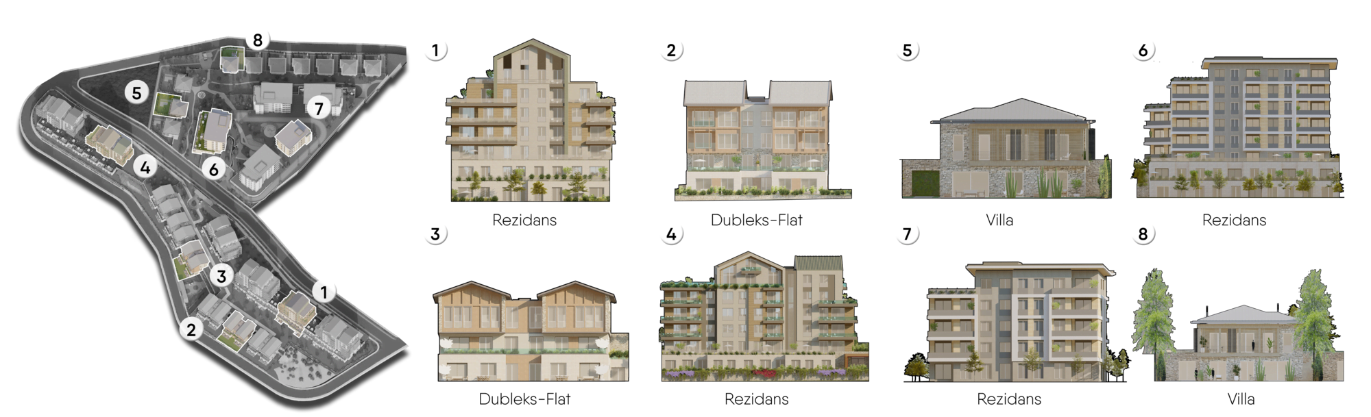 Villa, dubleks daire ve orta katlı konut bloklarından oluşan yerleşim, doğal eğimi izleyen kademeli bir düzende kurgulanmıştır.