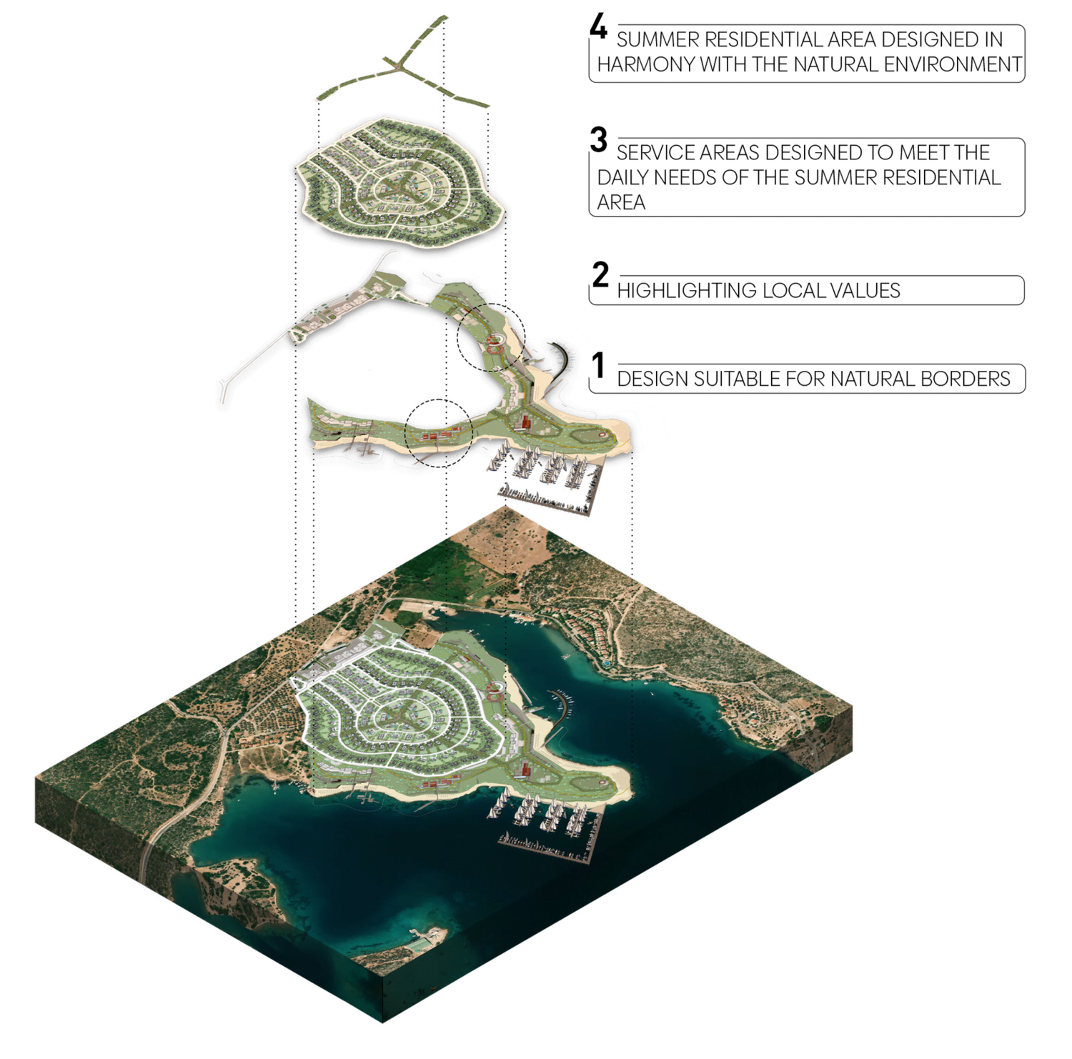 Masterplan, arazinin doğu yönlü eğimini ve mevcut doğal eşikleri esas alarak geliştirilmiştir. Manzaraya açılan yamaçlar yapılaşma için değerlendirilirken; yerleşime uygun olmayan bölgelere ağaçlandırma yapılmış ve bu sayede ekolojik süreklilik sağlanmıştır. Mevcut topoğrafik yapı doğrultusunda villa yerleşimleri, deniz manzarasını azami şekilde gözeten bir yaklaşımla konumlandırılmıştır.