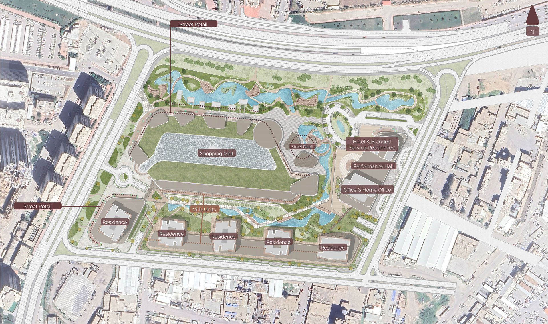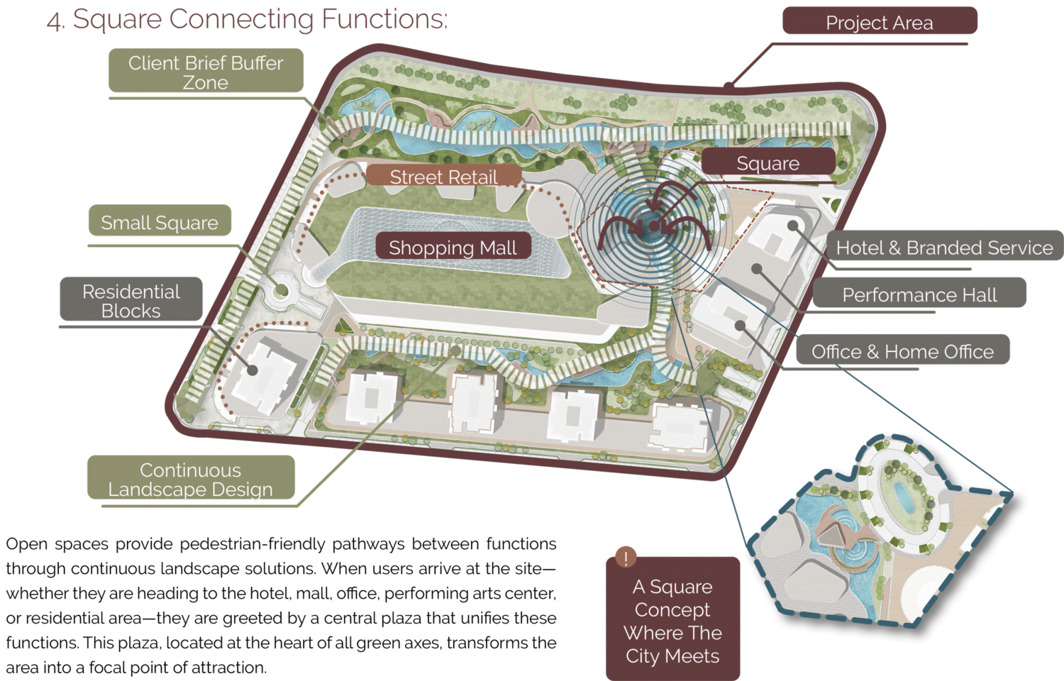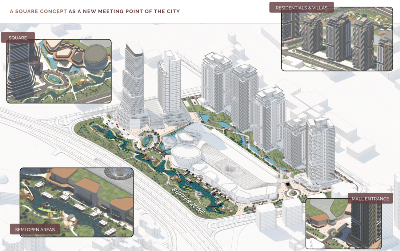 Projenin kalbinde tanımlanan merkezi meydan, farklı kullanımlar arasındaki geçişleri kolaylaştırırken sosyal hayatın da odak noktası haline gelmiştir. Tüm yeşil akslar bu noktada birleşerek bir çekim merkezi oluşturur. Meydan, otel, AVM, performans merkezi, ofis ve konutlara dağılan kullanıcı sirkülasyonunu karşılayan bir omurga işlevi görür.