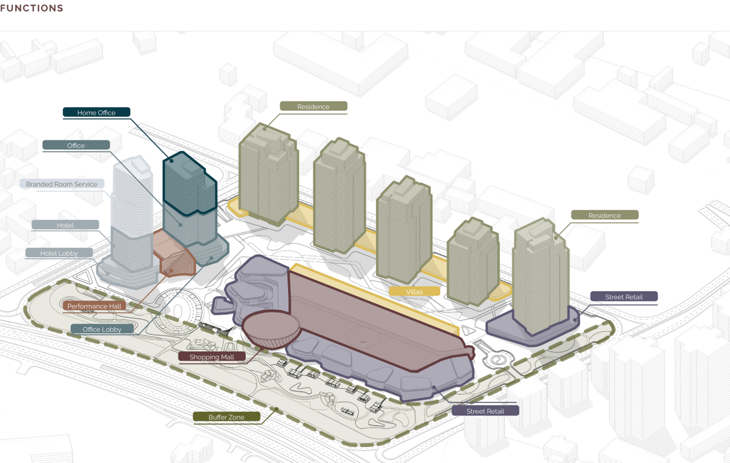 Proje, aynı yapı içinde ofis ve home-office gibi fonksiyonları ayrı girişlerle çözerek esneklik sağlamaktadır. Otel ve servisli konutlar da ortak bir kulede çözülmüş, fonksiyonel geçişler ile zenginleştirilmiştir.