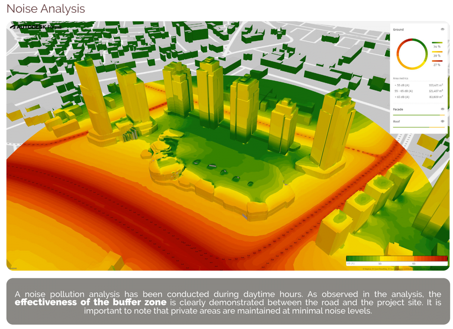 Kuzeydeki ana yolun oluşturduğu gürültü problemi, alışveriş alanı ile yol arasına yerleştirilen yeşil bir tampon alan ile çözümlenmiştir. Bu alan yalnızca ses bariyeri değil; spor alanları, gölgelikler ve yansıma havuzlarıyla aktif yeşil alan işlevi de üstlenmektedir.