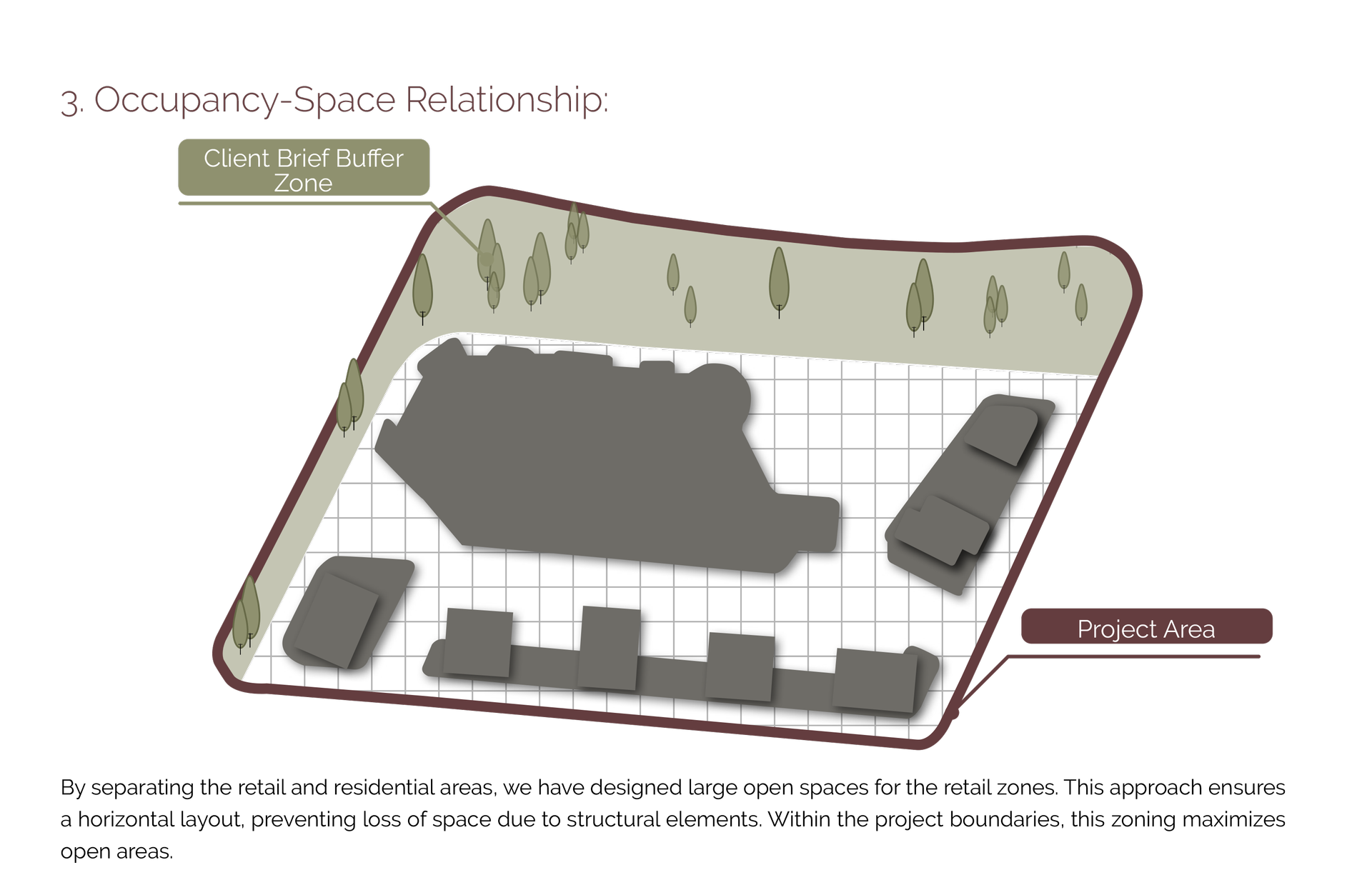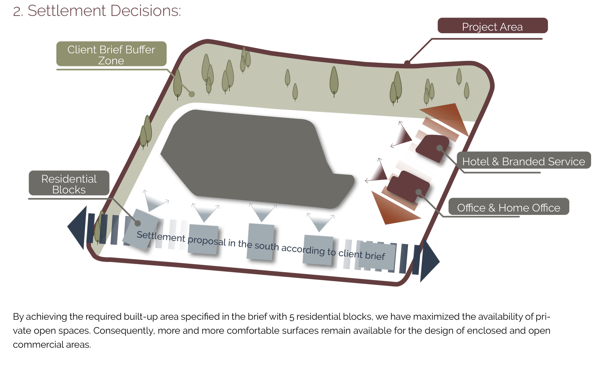 Proje, 5 konut bloğu ile brifingde belirtilen inşaat alanını sağlayacak şekilde planlanırken, bu yoğunluk açık ve yarı açık alanlarla dengelenmiştir.