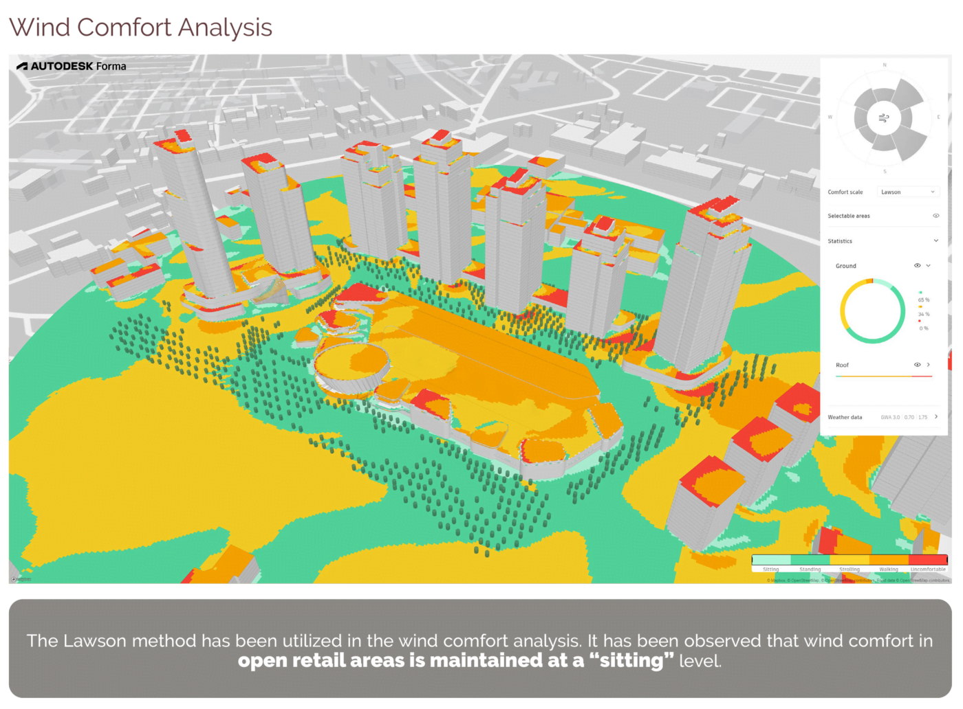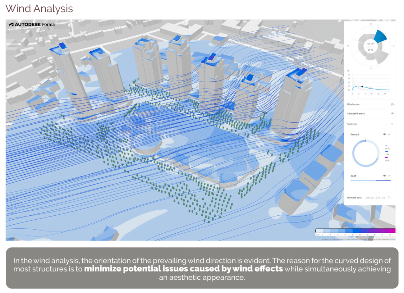 Süleymaniye’nin sıcak ve kuru iklimine cevap olarak, yapı kütleleri hakim rüzgar yönüne göre şekillendirilmiş, rüzgar etkilerini azaltacak kıvrımlı formlar tercih edilmiştir. Açık alanlarda rüzgar konforu “oturma” düzeyinde sağlanmış; su öğeleriyle desteklenen yeşil alanlar ise mikro iklim koşullarını iyileştirmiştir.